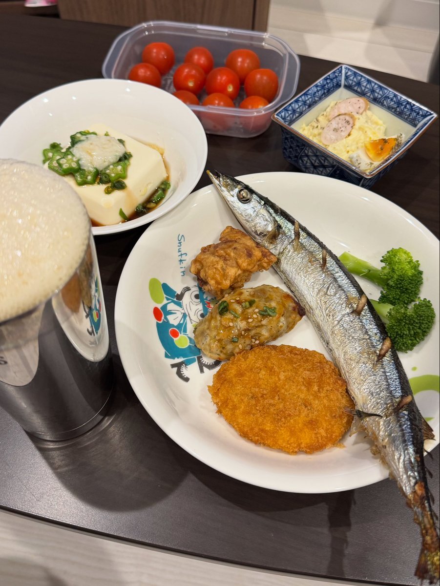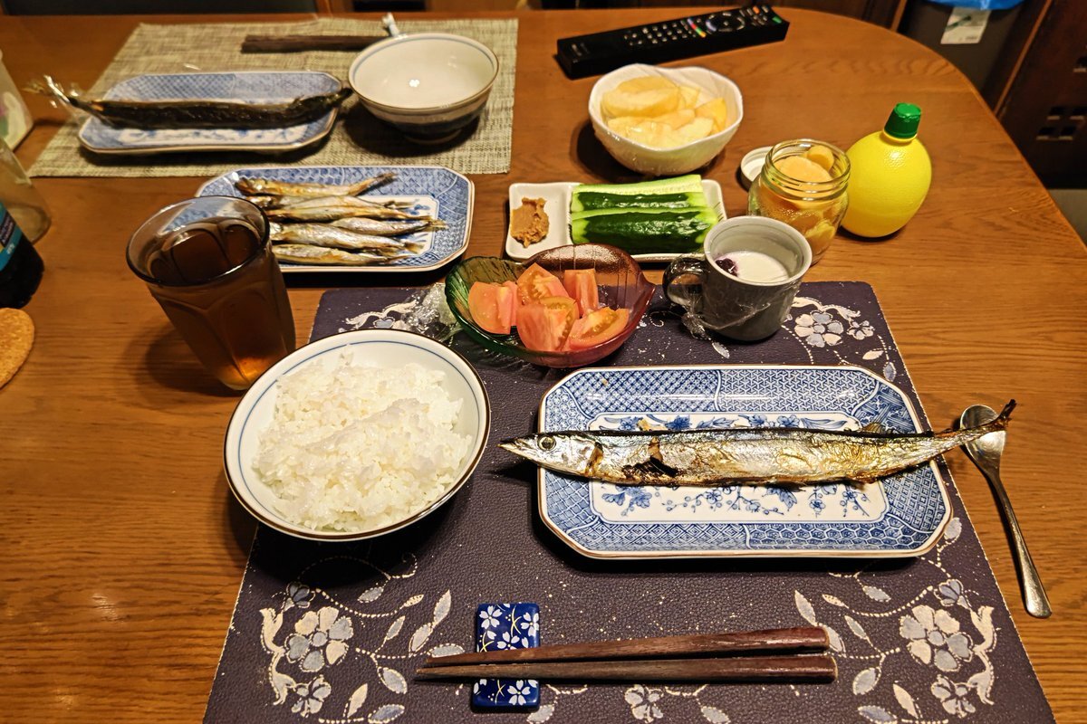 夕飯♪ ・ご飯 ・レンチンしたお惣菜の秋刀魚の塩焼き,レモン汁 ・レンチンしたお惣菜の子持ちからふとししゃもの焼き物,レモン汁 ・九州の沢庵 ・きゅうり,合わせ味噌 ・トマト,焼き塩 ・六条麦茶 ・リンゴ ・練乳&カシスジャムかけ手作り牛乳プリン ご馳走様♪ #夕飯 #秋刀魚の塩焼き #樺太ししゃも pic.x.com/UUfUcpj6aN