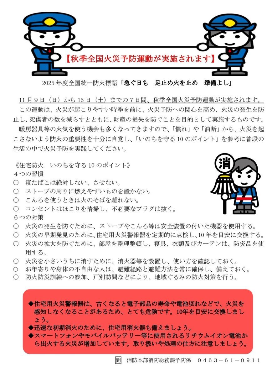 #秋季全国火災予防運動 (11月9日~15日) 秋季全国火災予防運動は、 #総務省 の外局である #消防庁 の主催で1950年(昭和25年)から実施されています。 火災が発生しやすい時期であり、火の取り扱いに注意しようと、全国火災予防運動が春(3月1日~7日)と秋(11月9日~15日)の年2回実施されています。