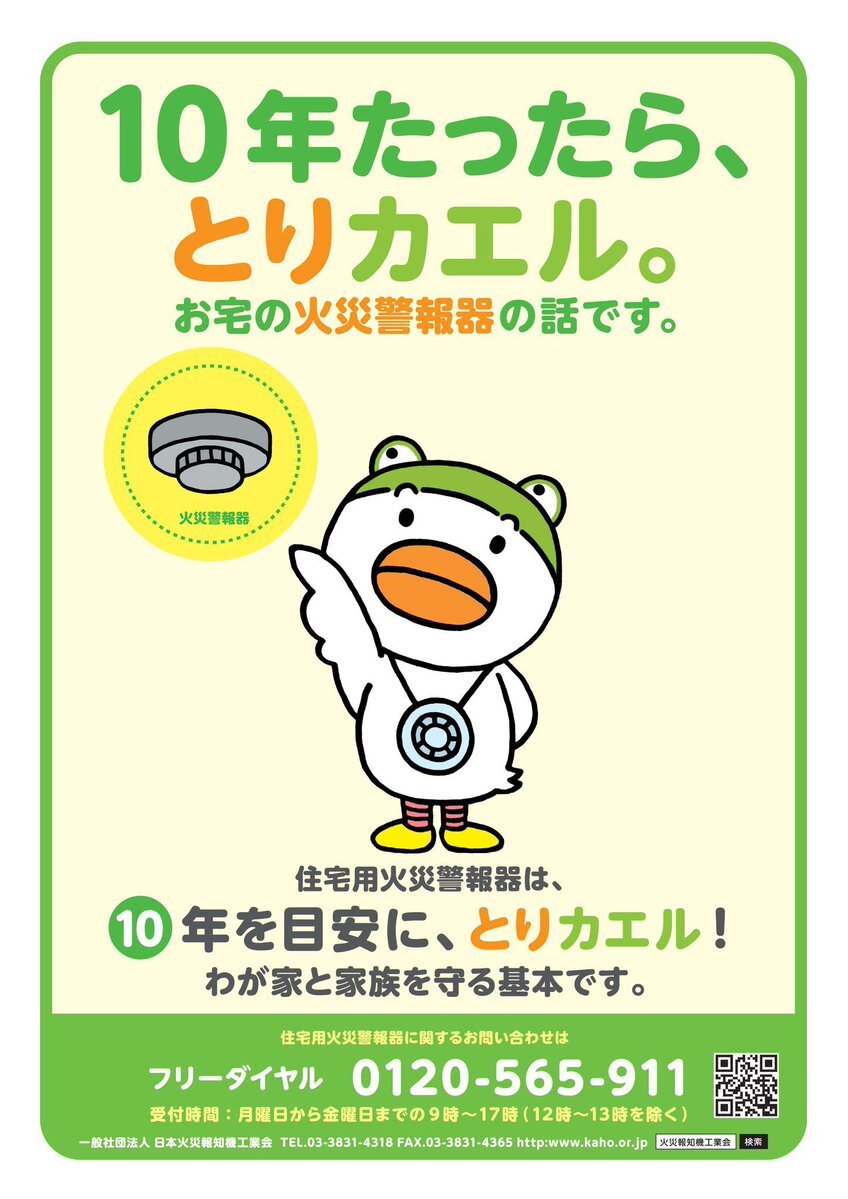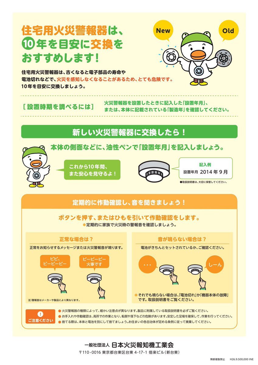 #秋季全国火災予防運動 】 火災で亡くなる原因で 最も多い「逃げ遅れ」を防ぐには、 #住宅用火災警報器 が有効です🔥 ⚠ 取扱説明書に従い、定期的に警報が鳴るかを確認しましょう! ⚠ 本体は10年を目安に交換しましょう! kokusen.go.jp/kiken/pdf/347d… pic.x.com/8tOu6eGPdK