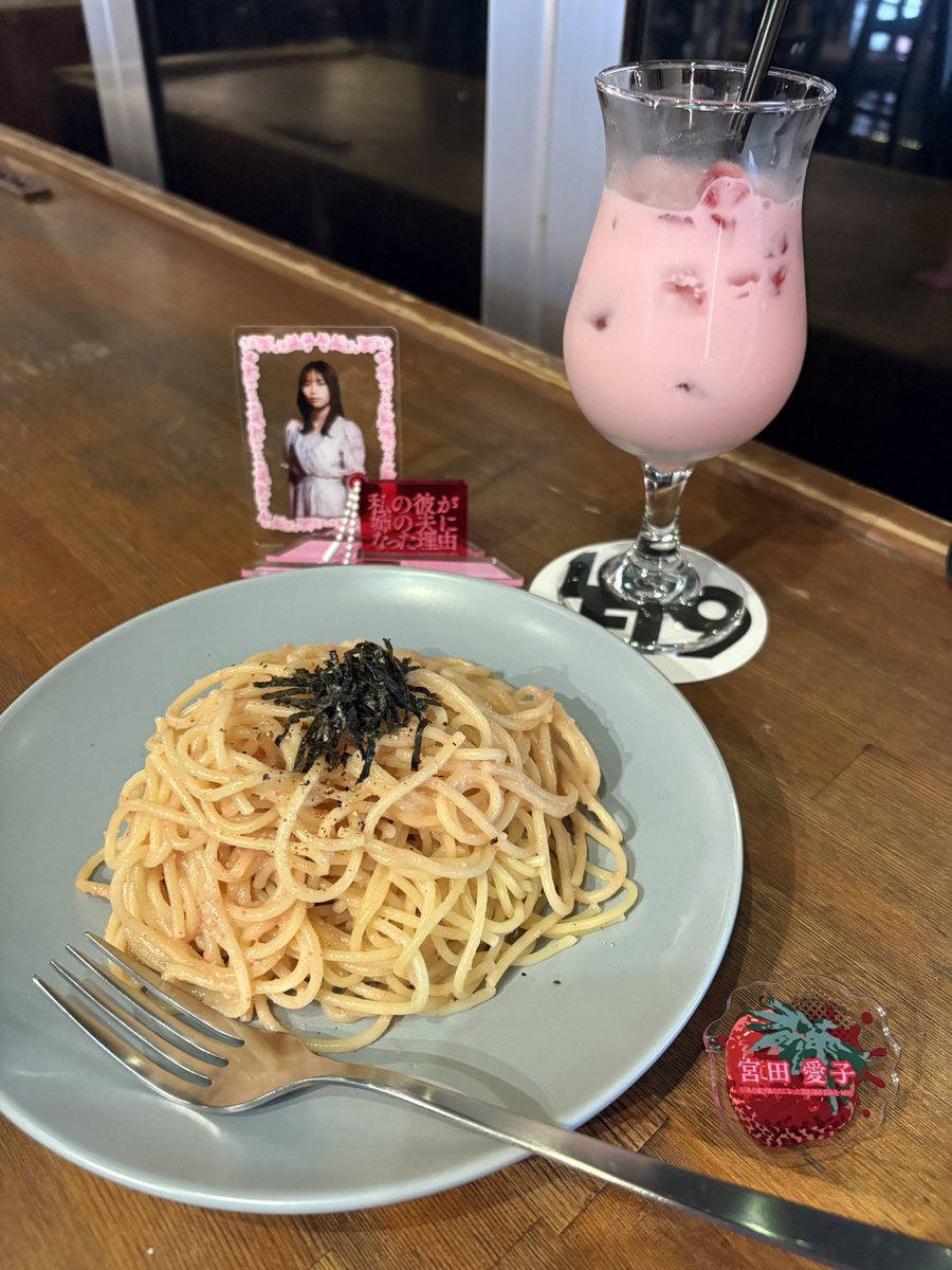 // #カレアネカフェ 営業中!!🍰 \\ 平日は店内利用OKの為ゆったりランチもおすすめです🍝🥤 愛子ドリンクはいちごみるく🍓 LOFT9渋谷(@LoftCafe9)の明太子パスタとあわせて、ピンクがいっぱい🩷🩷🩷 #私の彼が姉の夫になった理由 #秋田汐梨 #影山拓也(#IMP.) #高田里穂 pic.x.com/lYzVWTHrMB