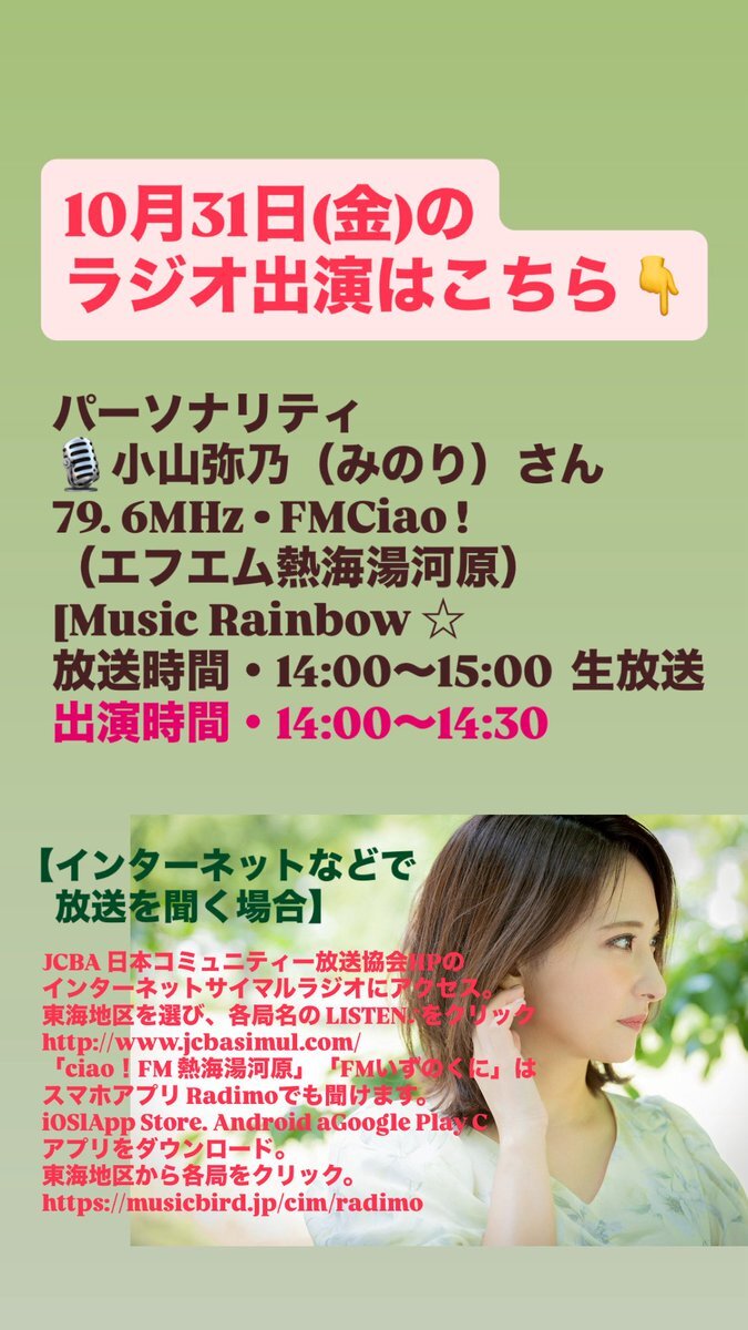 10月31日(金)のラジオ出演はこちら👇 パーソナリティ 🎙️小山弥乃(みのり)さん 79. 6MHZ • FMCiao! (エフエム熱海湯河原) [Music Rainbow ☆] 放送時間・14:00~15:00 生放送 出演時間・14:00~14:30✨ 是非聴いてくださいね♡ #エフエム熱海湯河原 #歌謡ポップスシンガー #ラジオ #秋風 pic.x.com/uUoIPgFVnu