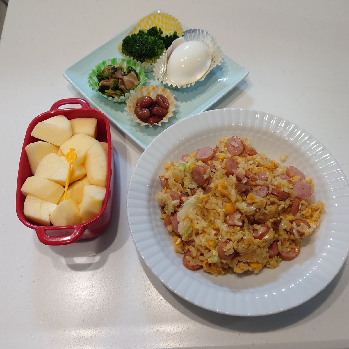 2025年10月31日 #お弁当🍱 No.454 ①黄金パラパラチャーハン ②ブロッコリー🥦の塩茹で ③ほうれん草とベーコン🥓のバター炒め ④半熟ゆで卵🥚(お塩添え) ⑤金時豆🫘 ⑥りんご🍎#長野県産 #秋風 pic.x.com/Or8sZoWqqv