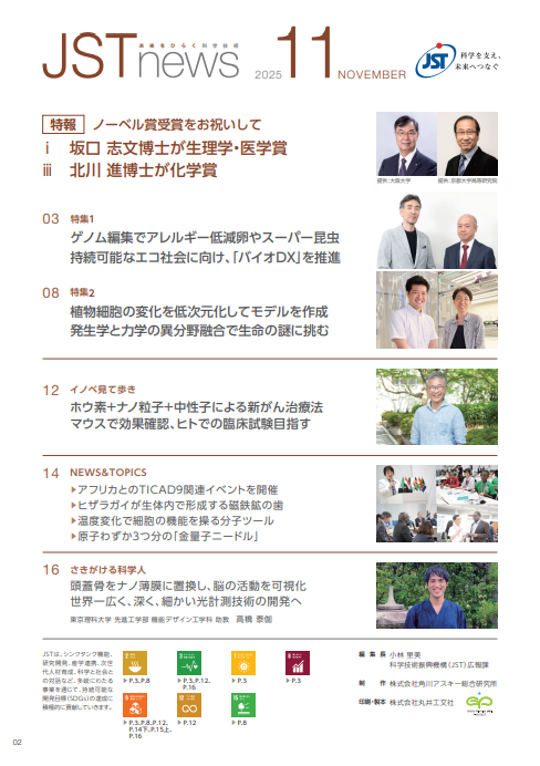 〈#JSTnews〉11月号を発行しました。 【特報】 ◆坂口 志文博士がノーベル生理学・医学賞を受賞 ◆北川 進博士がノーベル化学賞を受賞 そのほかに「特集」「連載:イノベ見て歩き」「NEWS & TOPICS」なども掲載しています。 ぜひご覧ください。 #JST #科学技術振興機構 jst.go.jp/pr/jst-news/ba… pic.x.com/Pshqm03FqF