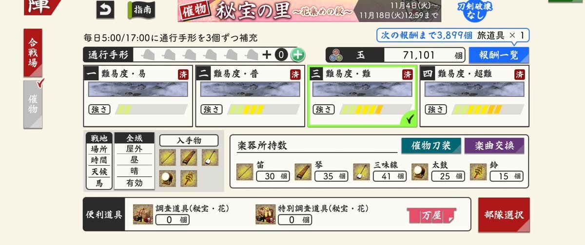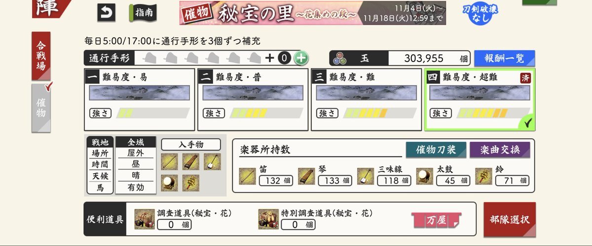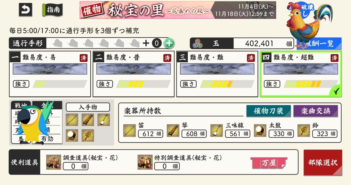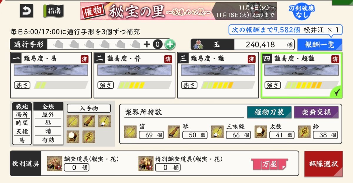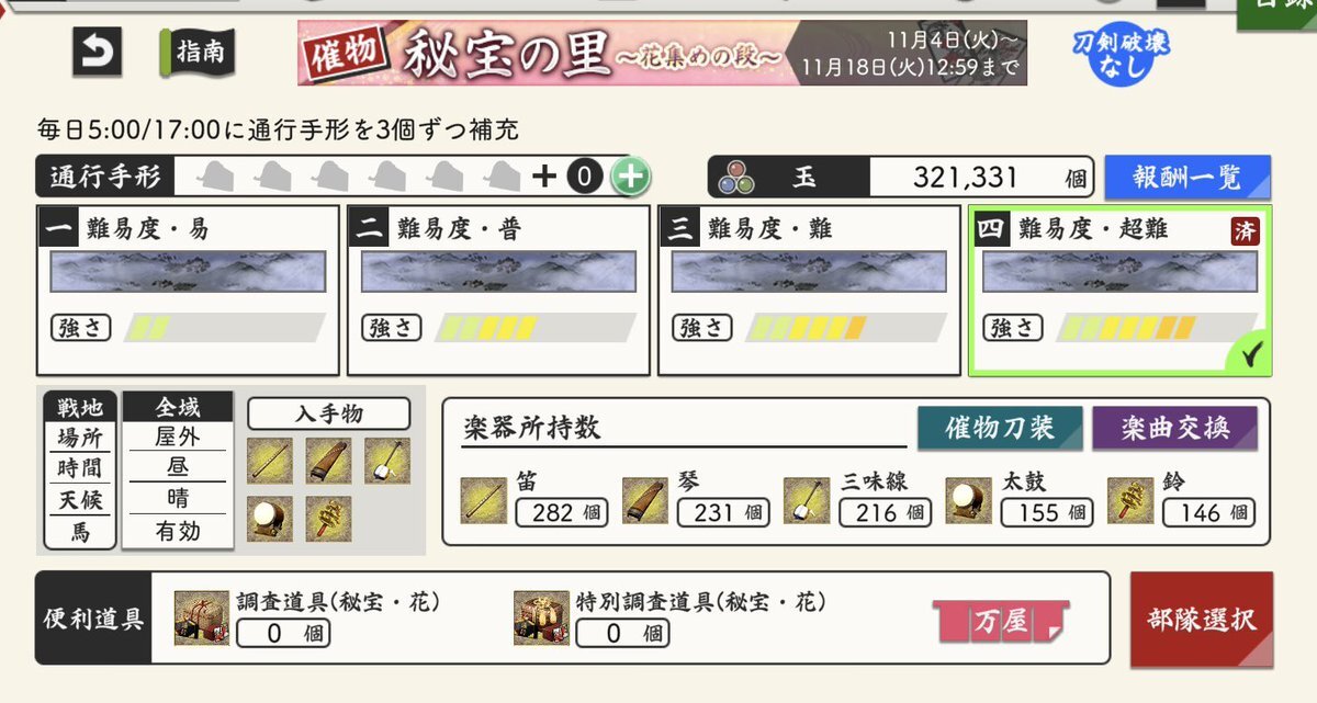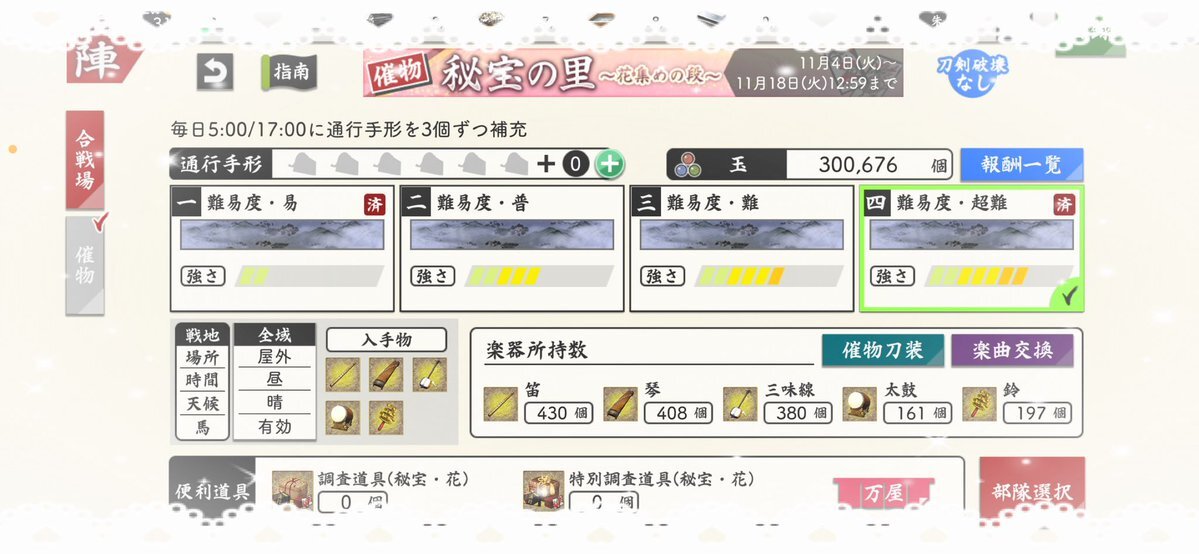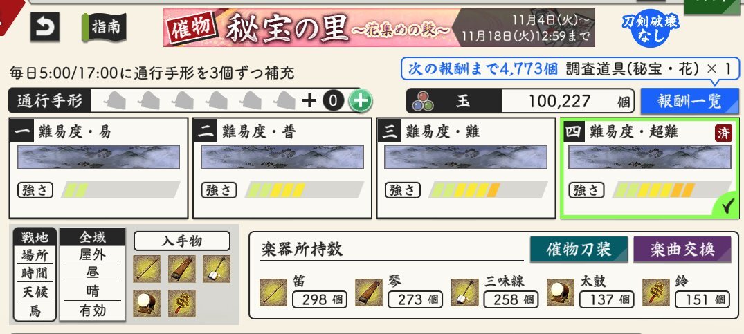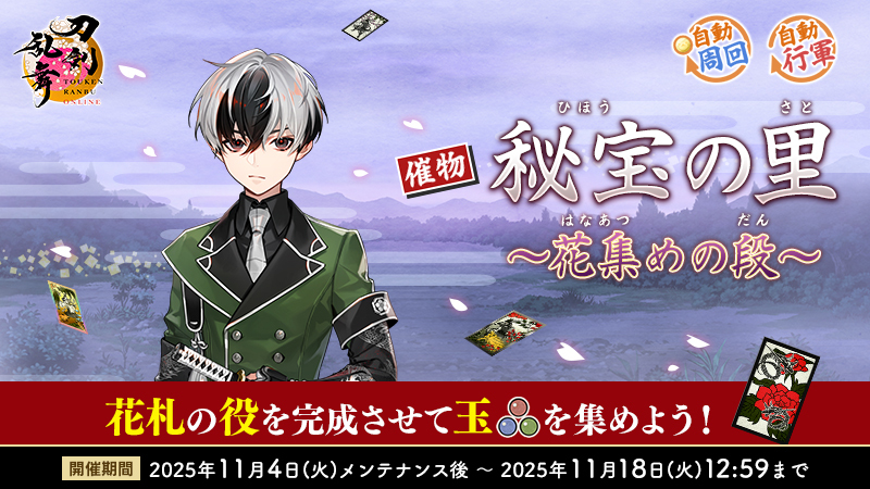 (1/3) 【催物情報】 開催中の催物「秘宝の里 ~花集めの段~」は11月18日(火)12:59で終了となります。万屋での催物専用便利道具の販売も終了となります。催物終了後、専用便利道具の未使用分は削除されますのでご注意ください。 #刀剣乱舞 #とうらぶ