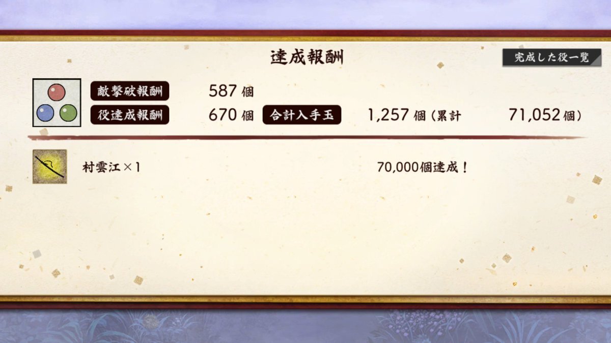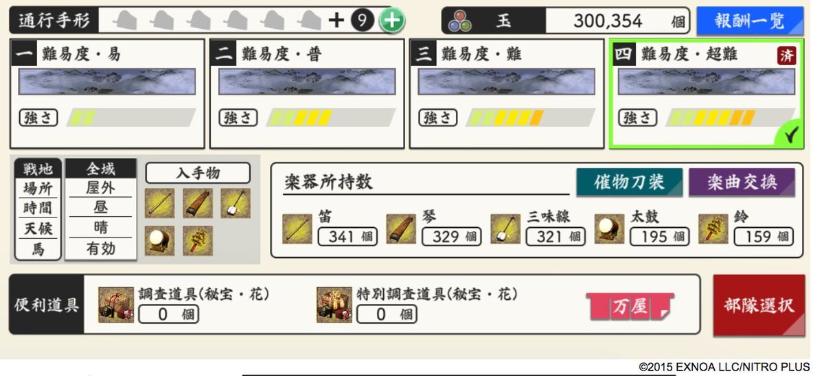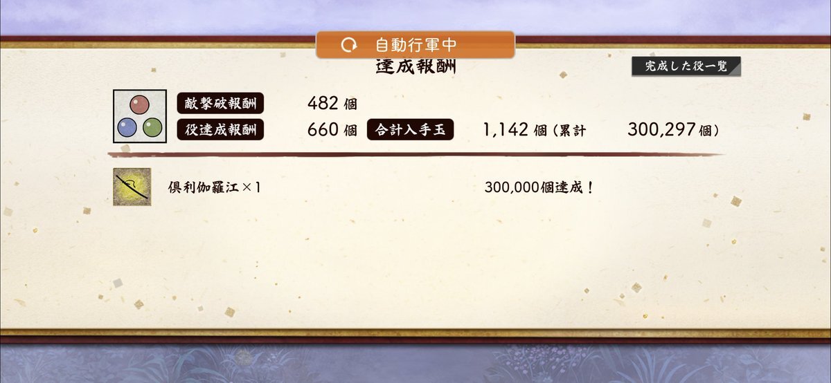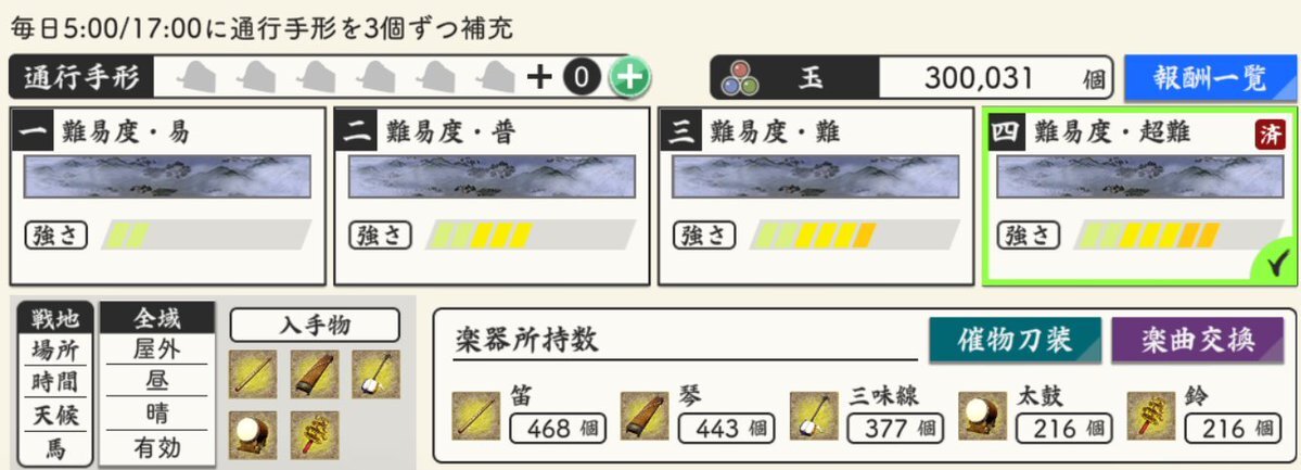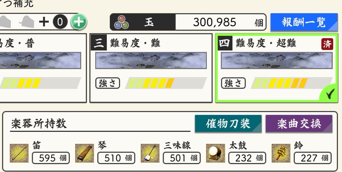 玉集め(楽器集め)最終結果! ○玉300985個。 ・笛 571→595(+24) ・琴 487→510(+23) ・三味線476→501(+25) ・太鼓 221→232(+11) ・鈴 214→227(+13) 小判は純減8550ってとこで。 #とうらぶイベント進捗メモ #秘宝の里 #玉集め進捗 pic.x.com/ZmHRDx6ZvZ