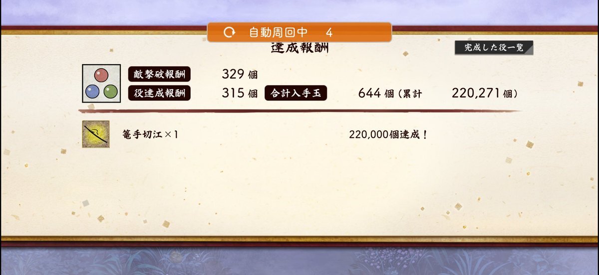 玉集め(楽器集め)8日目 ○玉215924個。 ・笛 590→591(+1) ・琴 504→504(+0) ・三味線490→492(+2) ・太鼓 229→231(+2) ・鈴 223→223(+0) #とうらぶイベント進捗メモ #秘宝の里 #玉集め進捗