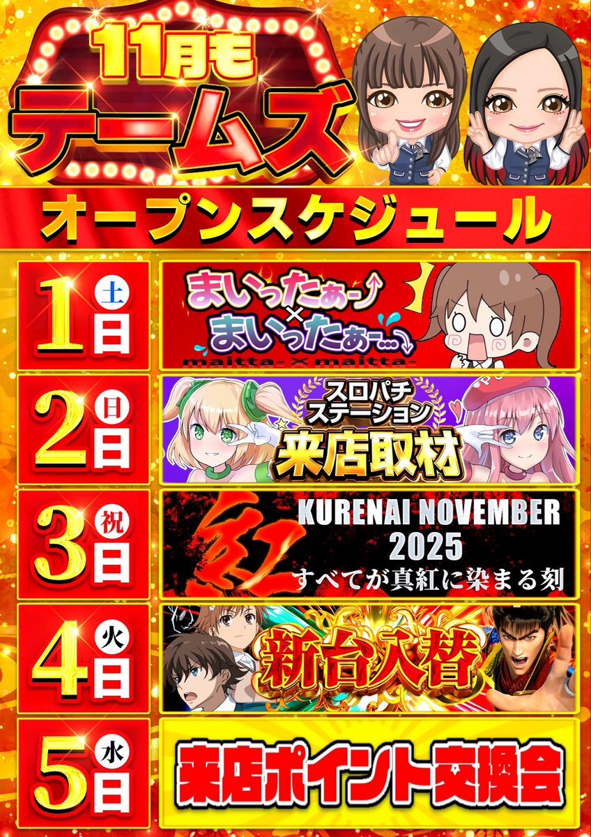 ◤◢◤◢◤◢◤◢◤◢◤ ◢◤ ◢ ☯️月末・月初もテームズで!☯️ ◤◢◤◢◤◢◤◢◤◢◤ ◢◤ ◢ 今後の営業スケジュールのご案内です🗓️ ◾️10月31日(金曜日)🎃 ・19時メダル機コーナー時差開放🌹 -------------------------------------- ▪️11月1日(土曜日) ・ #まいったぁまいったぁ 開催⭐️ ※