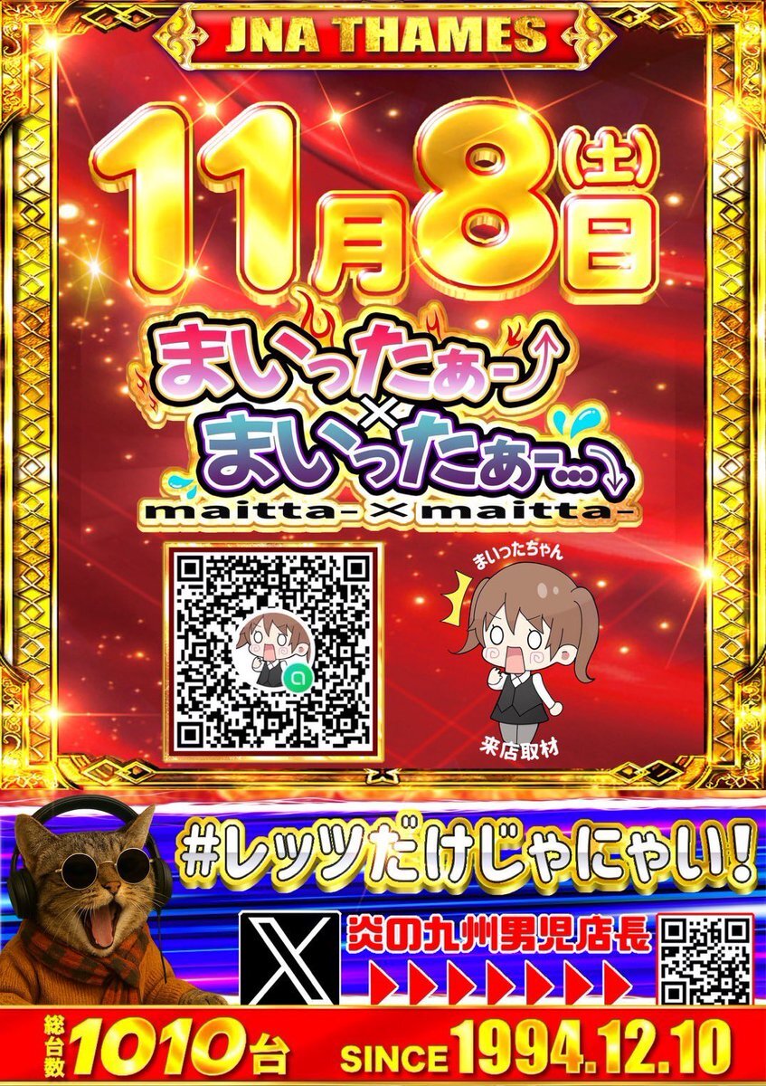🚨告知🚨 明日11月15日(土)はマイホのジャパンニューアルファテームズさんへ実践LIVE配信で邪魔させて頂きます✌️ 明日もまいったぁ×テームズ×白金ブイ🔥 前回は良番引けなくても新台を中心にしっかり楽しめる日だったので明日も抽選ダメでも舞えるはず👍 抽選は8時45分✅ 配信は9時30分頃から🎥 x.com/v_datsusara/st…