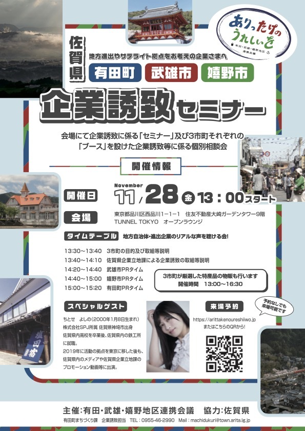 【企業立地・移住支援の取組例】佐賀県の有田町では、武雄市、嬉野市とともに11月28日(金)に企業誘致セミナーを実施予定。セミナーでは企業誘致・移住関連の個別相談の他、特産品販売も実施。また、地元佐賀県出身ゲストによるプロモーションも予定。 town.arita.lg.jp/kiji0033509/3_… #企業立地#移住支援 pic.x.com/5x7ZUcWF4h