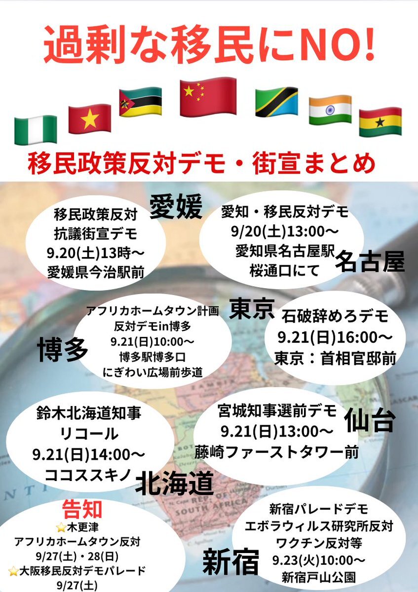 9/19 📣最新情報 🇳🇬🇬🇭🇲🇿🇹🇿🇮🇳🇵🇰🇧🇩🇨🇳🇰🇷 【 過剰な移民断固反対‼️ 】 📣週末デモ行かない?! 🗓️9/20(土) 【愛媛 今治】移民反対デモ 【名古屋】移民反対デモ 🗓️9/21(日) 【東京】石破辞めろデモ 【博多】街宣デモ 【北海道】鈴木県知事リコール 【仙台】宮城県知事前デモ 共に戦おう!!!!!