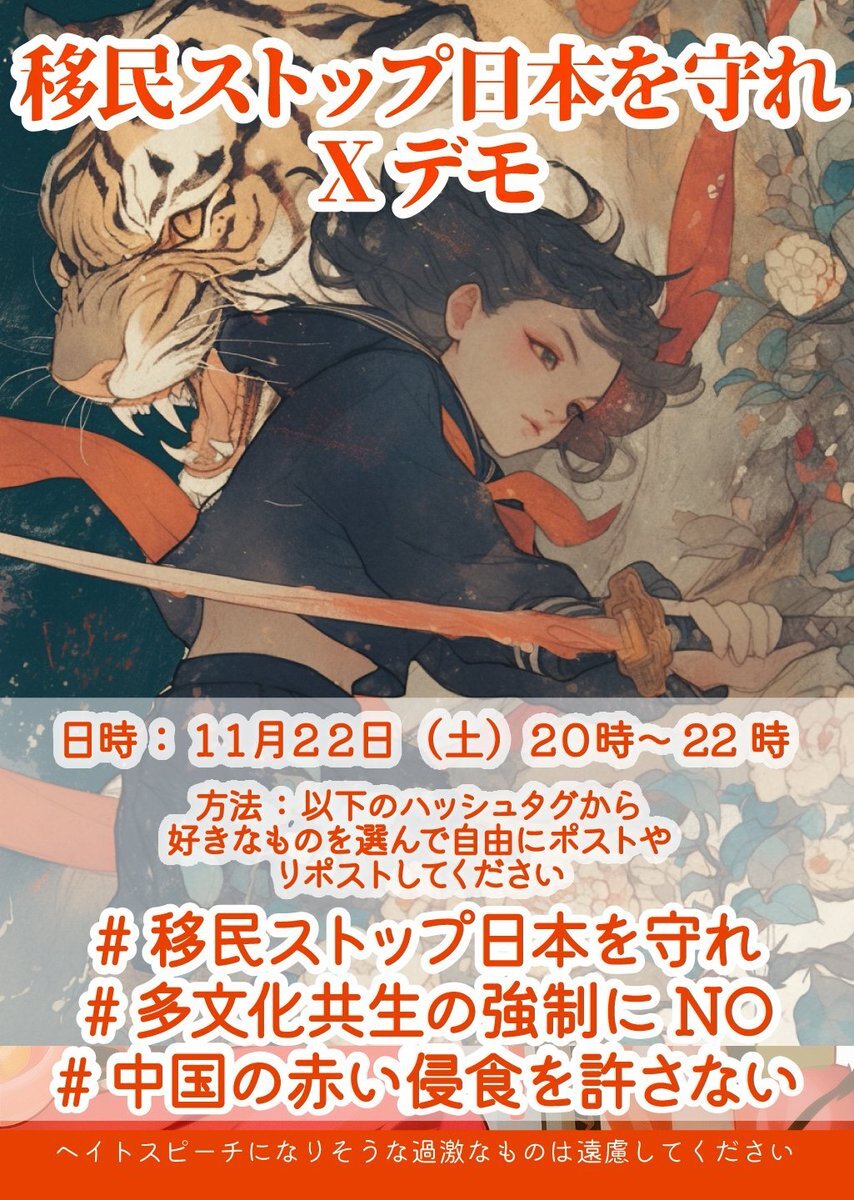 【拡散希望】 📢移民ストップ日本を守れXデモ 🟠11月22日(土) 20時~22時🔵 指定のタグをポストorリポスト #移民ストップ日本を守れ #多文化共生の強制にNO #中国の赤い侵食を許さない 皆さんの声が頼りです! いいね、リポストも大歓迎! 移民反対の声を政府に届かせましょう x.com/RN277628616667…