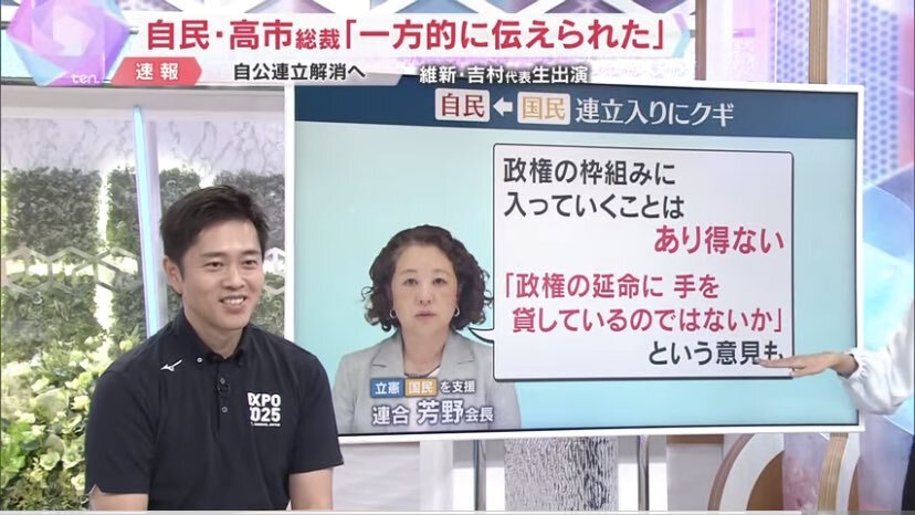 総裁選中は維新を「政権の延命に手を貸している」と叩いていた国民民主が連合に同じことを言われていると指摘された時の吉村さんの表情が秀逸。 維新・吉村代表がスタジオ生出演 公明党・斉藤代表「連立政権はいったん白紙」自公連立解消へ 維新はどこと組む?youtu.be/fHqYru8g5Ko?si…