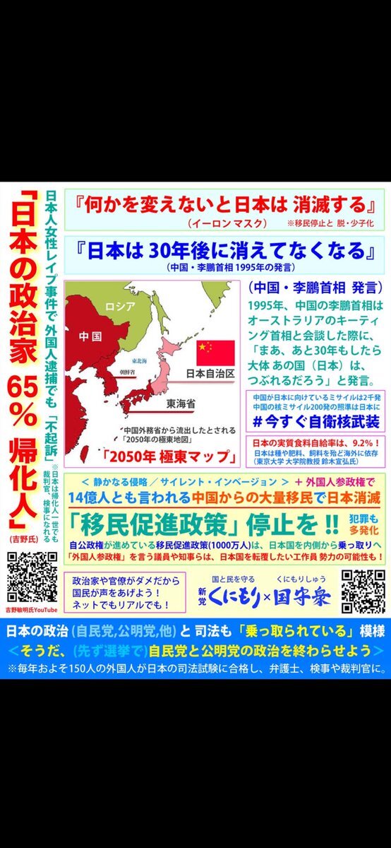 桜井誠さんの言っていた事は本当だった! 何かあってからでは遅い! 支那中共の植民地にされる前に 何としても日本を守ろう! #移民ストップ日本を守れ #多文化共生の強制にNO #中国の赤い侵食を許さない #アフリカホームタウンの白紙化を #エジプト人受け入れ反対 #移民推進する政党を落選させよう x.com/smith_john8727…