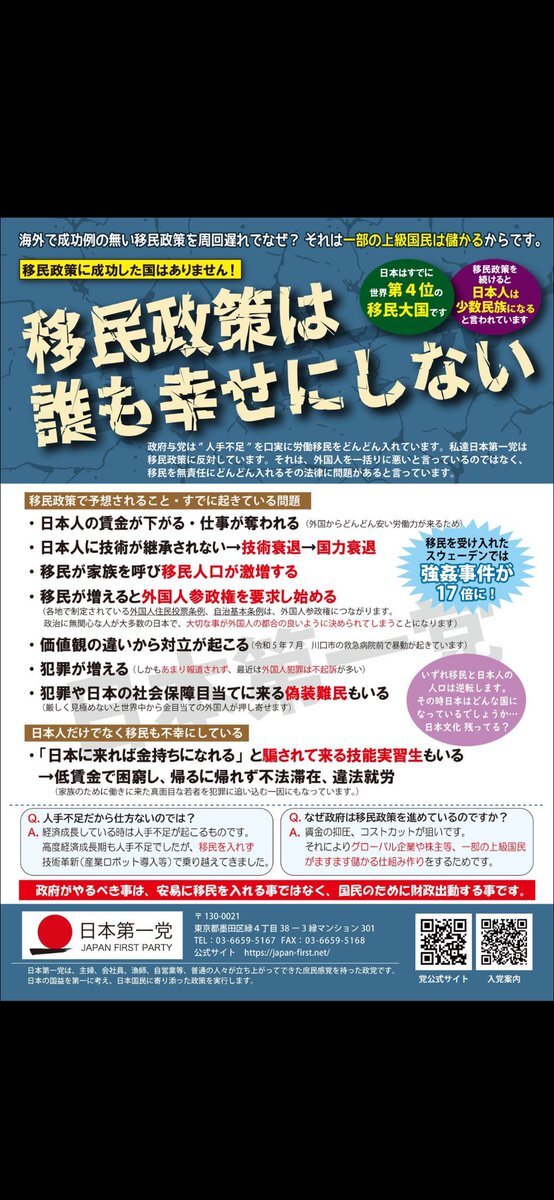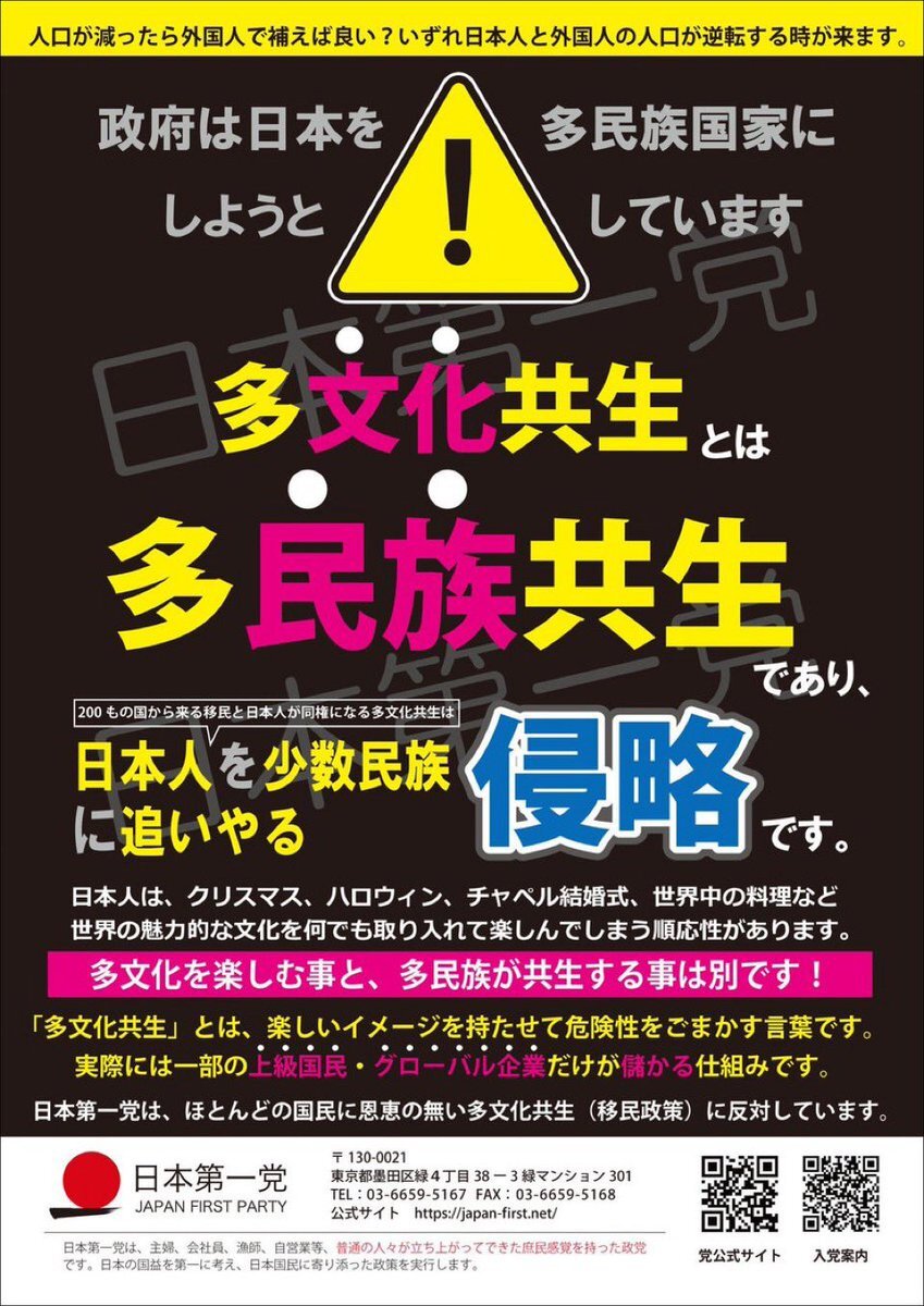 #移民ストップ日本を守れ #多文化共生の強制にNO #移民推進する政党を落選させよう #日本第一主義は差別にあらず #ワールドファーストよりジャパンファーストを そも移民政策は既に失敗であると多くの国で証明されている なのに取り入れようとは時代錯誤にも程がある 国を守るのが政治家の仕事でしょ