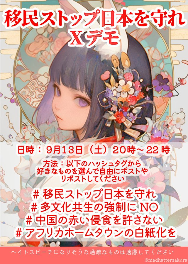 📢移民ストップ日本を守れXデモ 🟠9月13日(土) 20時~22時🔵 指定のタグをポストorリポスト #移民ストップ日本を守れ #多文化共生の強制にNO #中国の赤い侵食を許さない #アフリカホームタウンの白紙化を 皆さんの声が頼りです! いいね、リポストも大歓迎です 国民の声で移民のストップを!