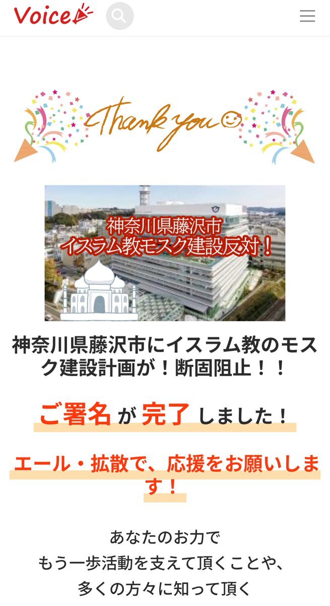 私も署名しました‼️ 皆さま、声をあげましょう‼️ 神奈川県藤沢市にイスラム教のモスク建設計画が!断固阻止!! voice.charity/events/7262 #モスク建設反対 #移民政策が日本を滅ぼす x.com/shigeyuki696/s…