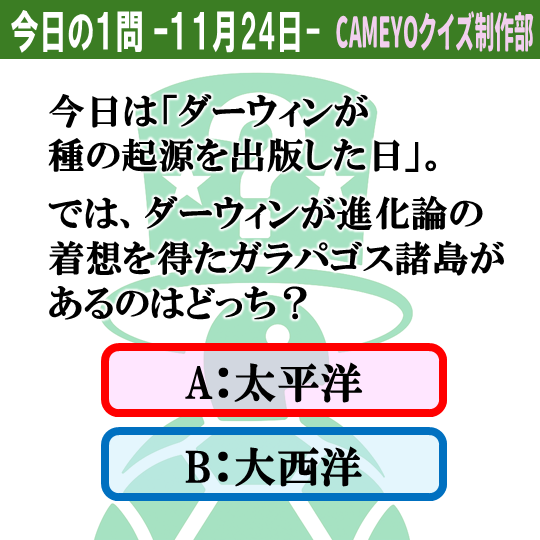 11月24日、月曜日 今日は、#進化の日(#Evolution_Day) 1859(安政6)年11月24日、#チャールズ・ダーウィン氏 の著書 『#種の起源(#On_the_Origin_of_Species)』 が発行されたことにちなみ、#国際デー として #記念日 を制定。 著書の中の説は、一般的に『#ダーウィンの進化論』と呼ばれている。