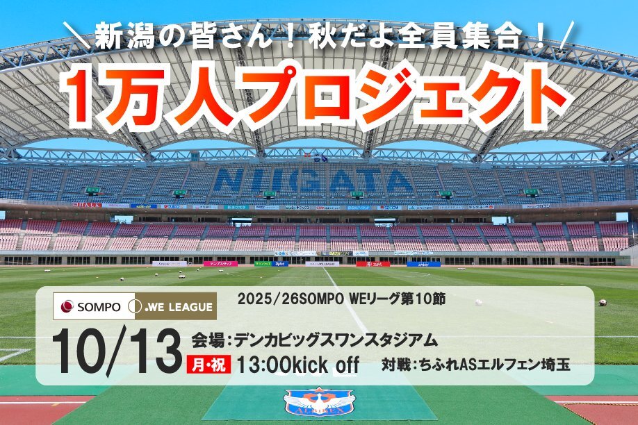 / 目指せ1万人! 大熱狂のスタジアムでチームの後押しを🔥 \ 10/13(月・祝)に開催する #SOMPOWEリーグ 第10節(EL埼玉戦)を集客重点試合として実施いたします🦢