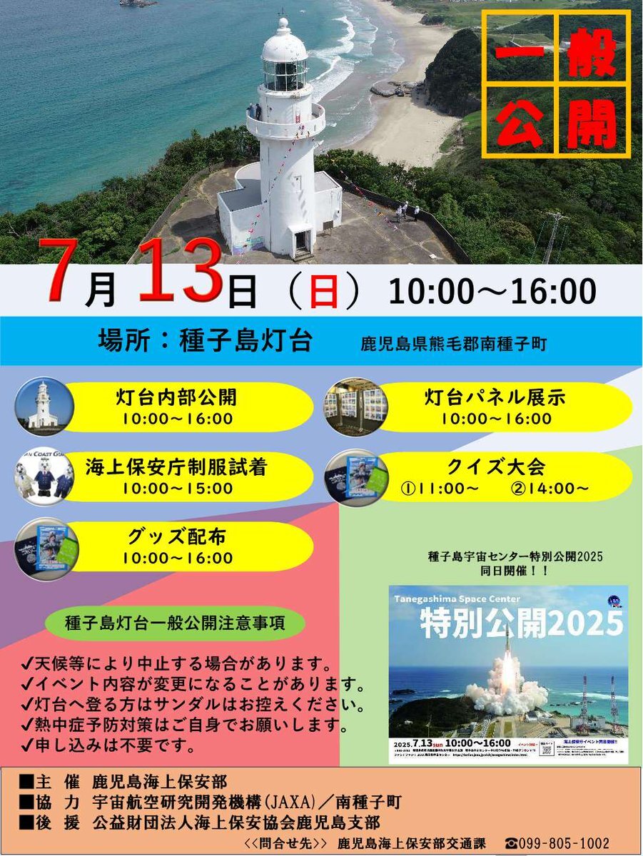 夏休みに灯台の #自由研究 はいかが? #鹿児島海上保安部 では7月13日に #種子島灯台 の一般公開を実施します! 普段見ることのできない灯台内部をぜひこの機会に!また、 #種子島宇宙センター も特別公開を実施していますので、両方見学して自由研究を終わらせちゃおう!! #第十管区海上保安本部 pic.x.com/pIs9a9Vusz