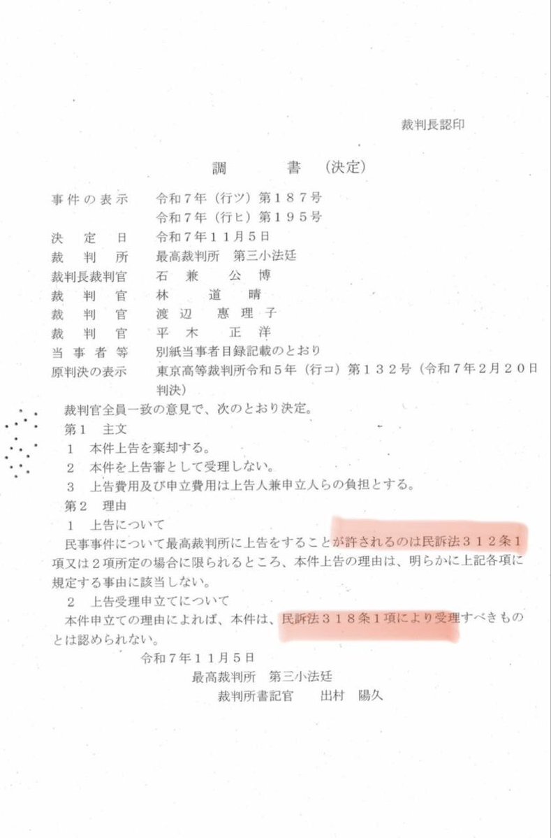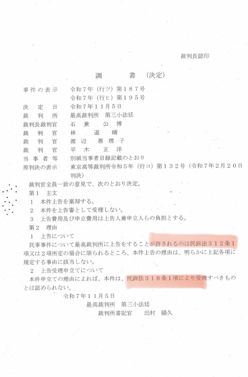 【悲報!】 種子法違憲訴訟、最高裁上告棄却に! 人間が生きていく上で絶対に犯してはならない食の権利に対し、不当な判断で受理しなかった裁判官の名前はこちら。 裁判長:石兼 公博 裁判官:林 道晴 裁判官:渡辺 恵理子 裁判官:平木 正洋 【民訴法第312条】 ja.wikibooks.org/wiki/%E6%B0%91… x.com/saveseedsjapan…