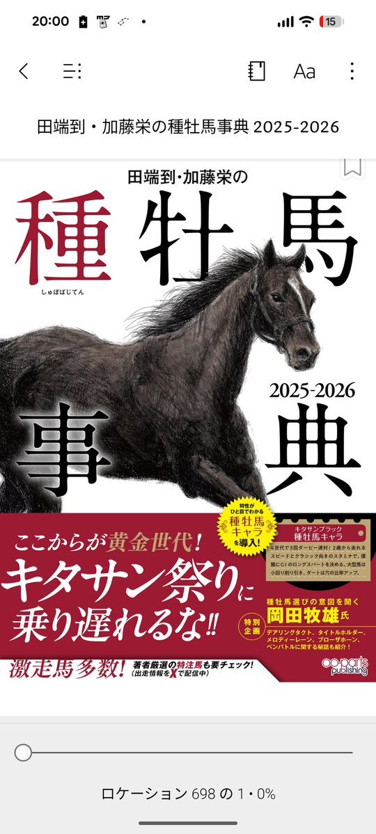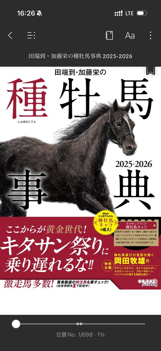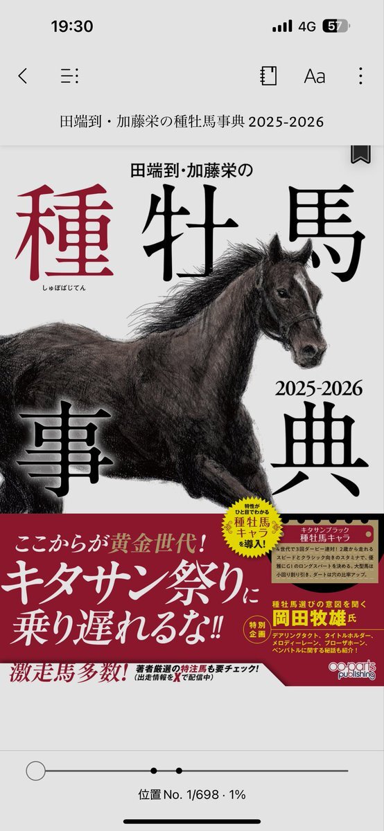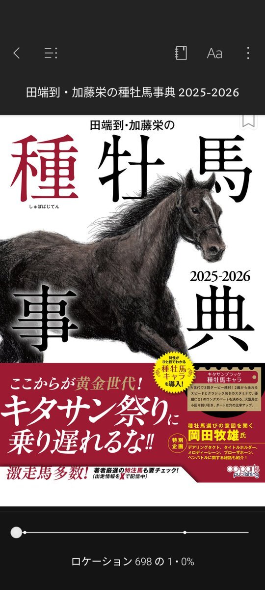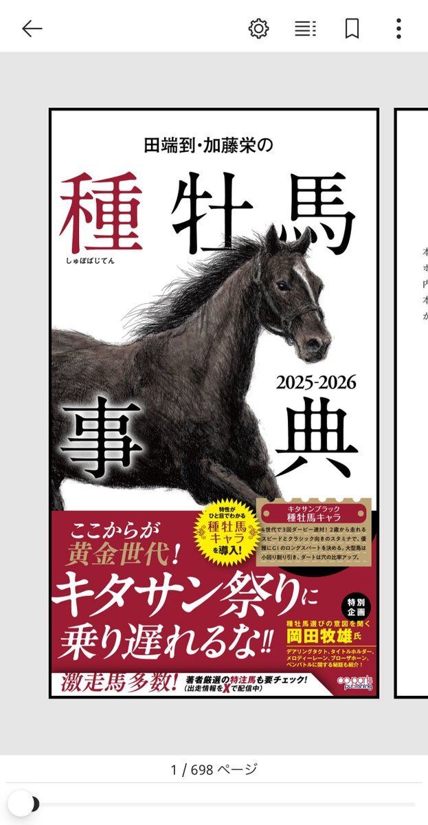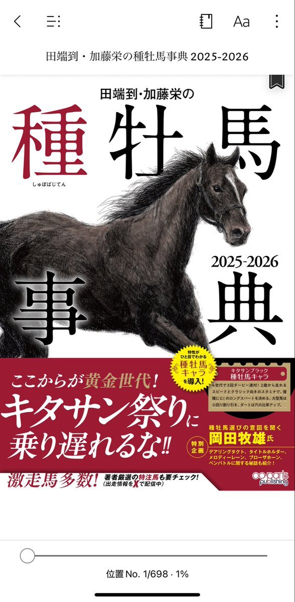 今年も発売を待っておりました王様と長老の種牡馬事典🐴📖 サラブレ時代から大変お世話になっております。 持ち運びができる電子版はいつでもどこでも読めて便利。 今年も総ページ数698ページ、これはやってますなぁ 笑 #種牡馬事典2025 pic.x.com/Tq4v670Rid x.com/oo_parts1/stat…