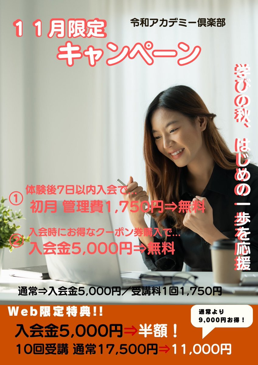 【11月限定キャンペーン】 Web限定特典でお得にスタート!申込時に「Webを見た」でもOKです👍 学びの秋に、新しいチャレンジを始めませんか? #稲毛海岸 #京葉線 #令和アカデミー倶楽部 #パソコン教室 #シニア応援 #初心者歓迎 #学びなおし pic.x.com/FXWKfexq8a