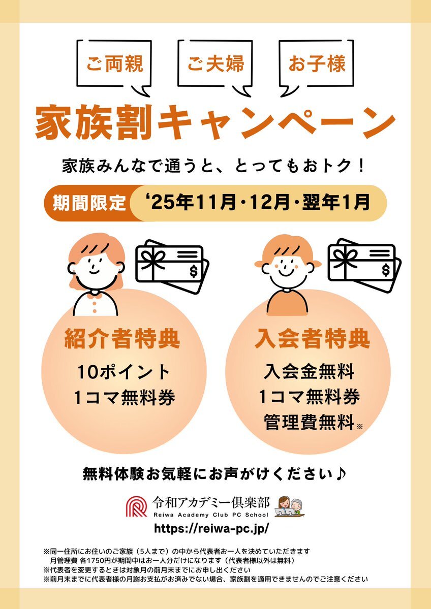 📣家族で通うと、とってもおトク! 【家族割キャンペーン】開催中✨ 期間限定:11月〜1月まで紹介・入会のどちらにも特典あり🎁 無料体験も実施中です♪ この機会にぜひ、家族みんなでパソコンを楽しく学びましょう💻 #家族割 #パソコン教室 #令和アカデミー倶楽部 #稲毛海岸 #キャンペーン #京葉線 pic.x.com/kmtTlkc8XN