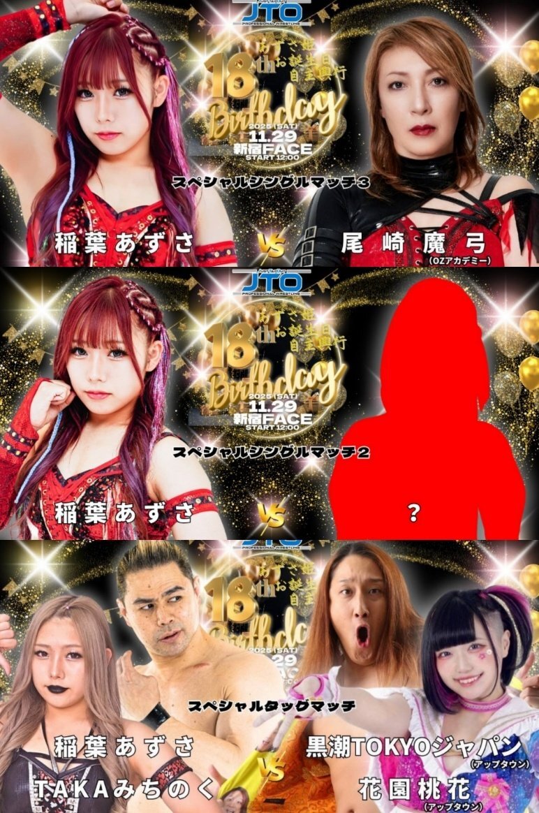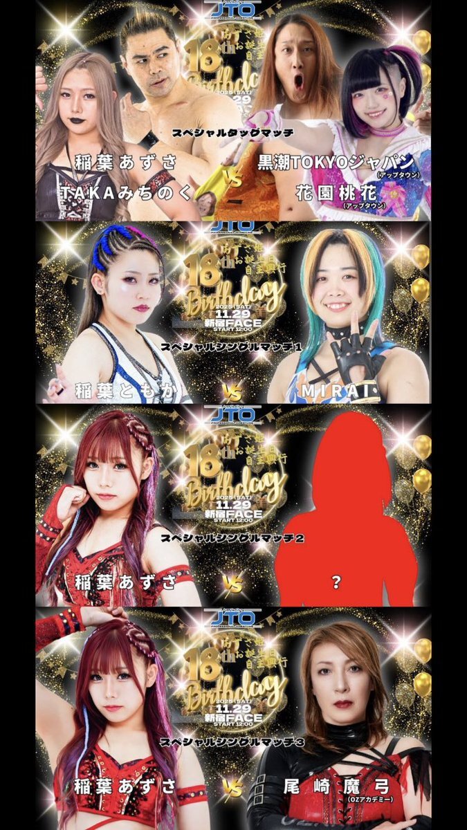 あずさ姫の18歳の誕生日に行われる自主興行で注目なのは稲葉ともかちゃんとMIRAIちゃんの一戦とあずさ姫が3試合も登場すること。尾崎さんとのシングルマッチはどうなるか気になるし、何よりもXという対戦相手が誰なのか気になる・・・。 会場に足を運べる方は今すぐチケット購入を。 #稲葉あずさ x.com/AZS_JTO1129/st…