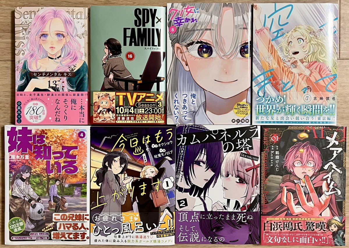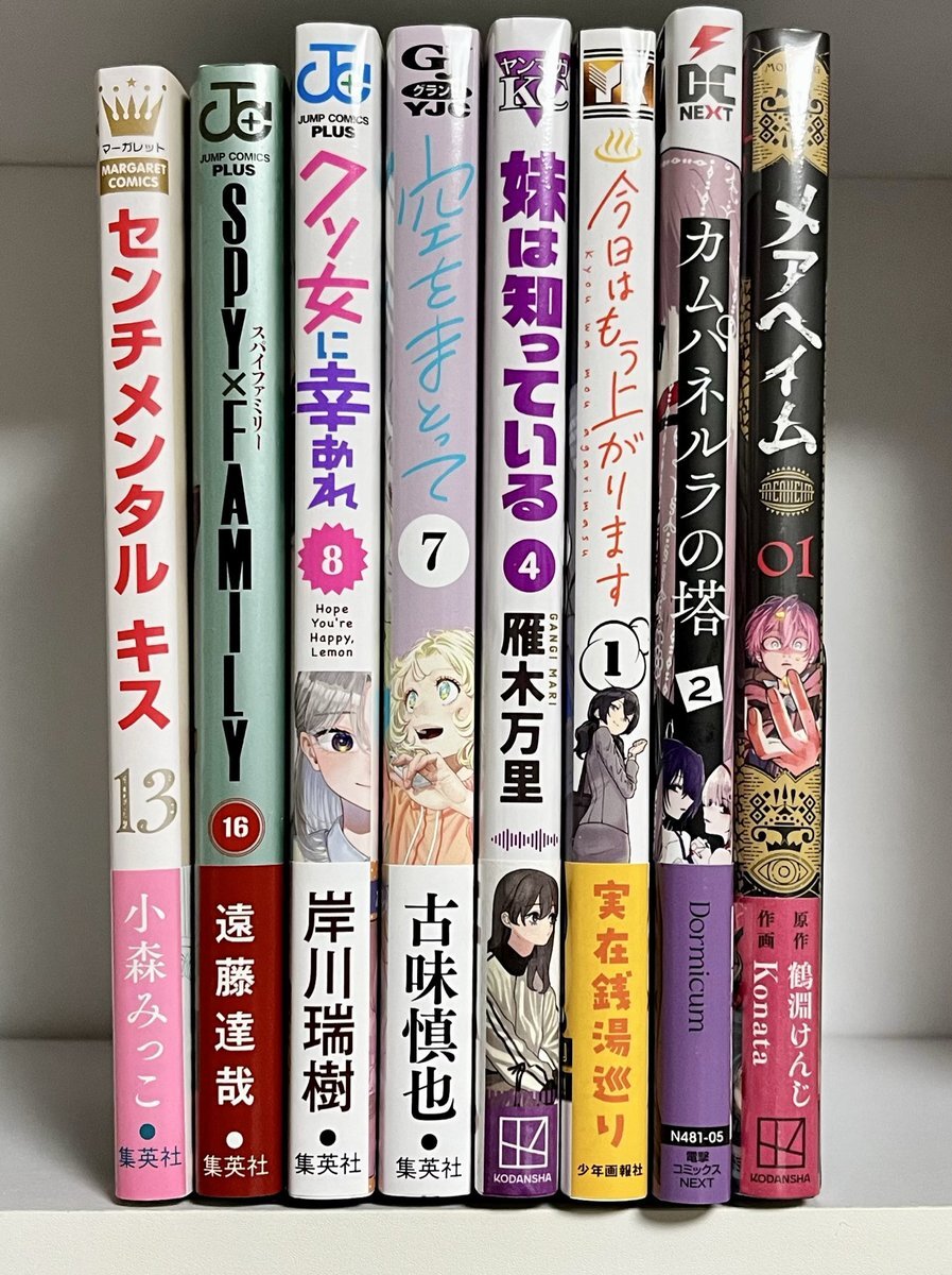 #今日買った漫画 #センチメンタルキス ⑬ #SPY_FAMILY ⑯ #クソ女に幸あれ ⑧ #空をまとって ⑦ #妹は知っている ④ #今日はもう上がります ① #カムパネルラの塔 ② #メアハイム ① SPY×FAMILYは載せ忘れ笑 #漫画好きと繋がりたい pic.x.com/uB6KWydL36