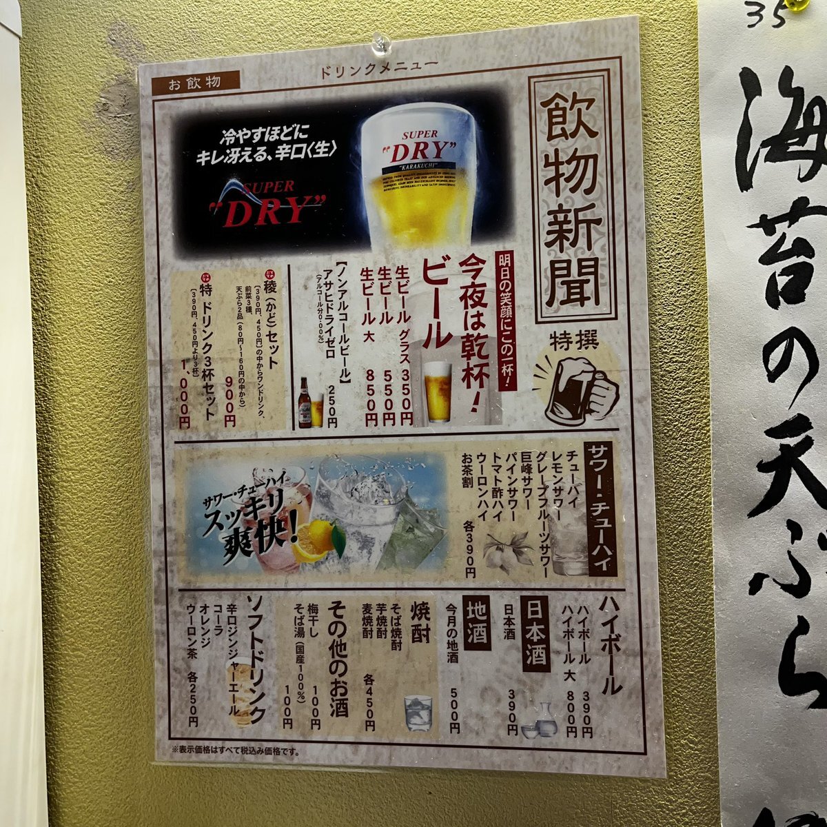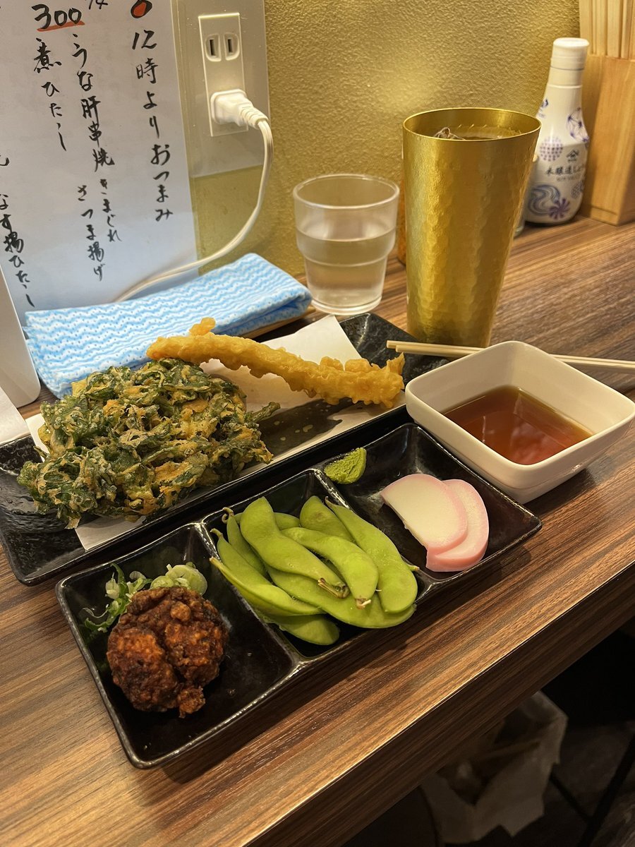 少し足を延ばし綾瀬の立ち飲みへ 稜セットはいか天・春菊天にハイボール 春菊天のサクサクパリパリ感が👍 前菜3種が付くのでグラス生ビール追加 酔き土曜の昼下がりでしたわ🍻 #立ち食い蕎麦酒処稜  #立ち飲み #路麺 pic.x.com/1yuV7wCzxF