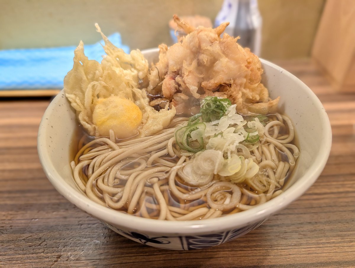 今朝は #立ち食い蕎麦酒処稜 さんへ ゲソ天そばに玉子天を追加 おつゆは出汁と返しの良き塩梅 モチッと食感の蕎麦も良き 初訪以来のゲソ天、プリブリなゲソと玉ねぎの甘さが最高 初玉子天は絶妙な黄身の火通し加減 朝から幸せな一杯 ごちそうさまでした #立ち食いそば #路麺 #綾瀬駅 pic.x.com/VGHnzn98qo