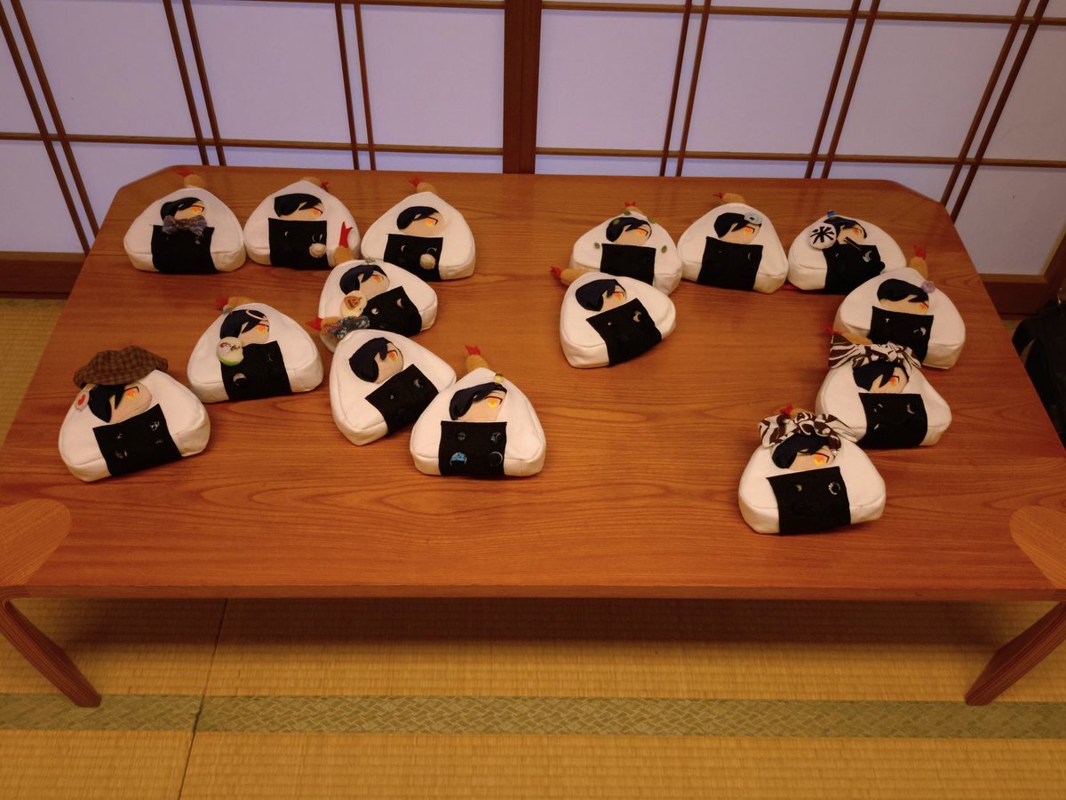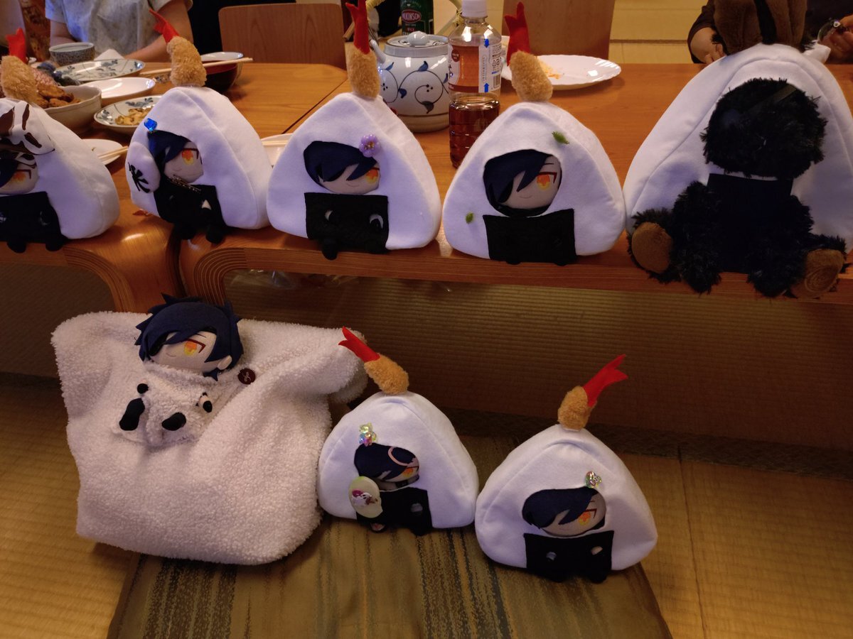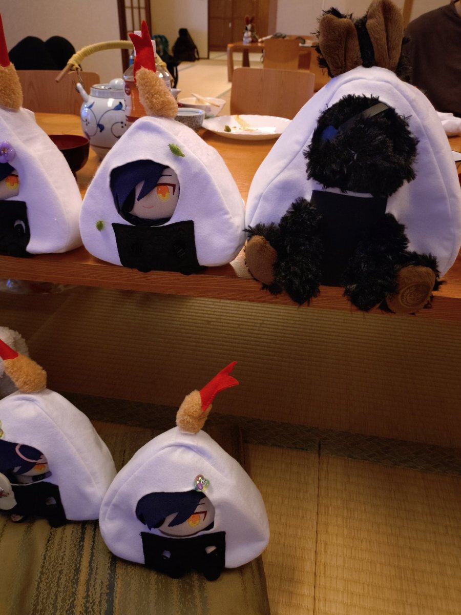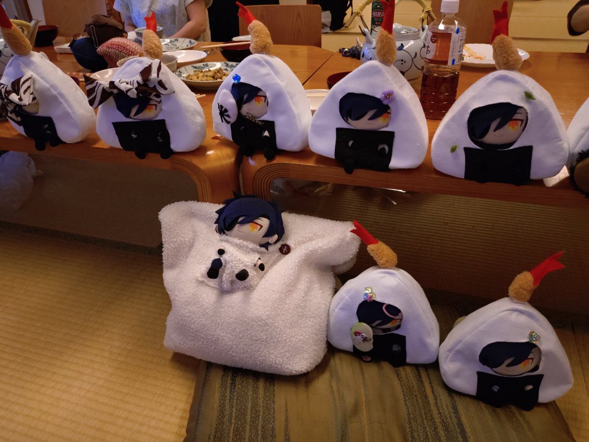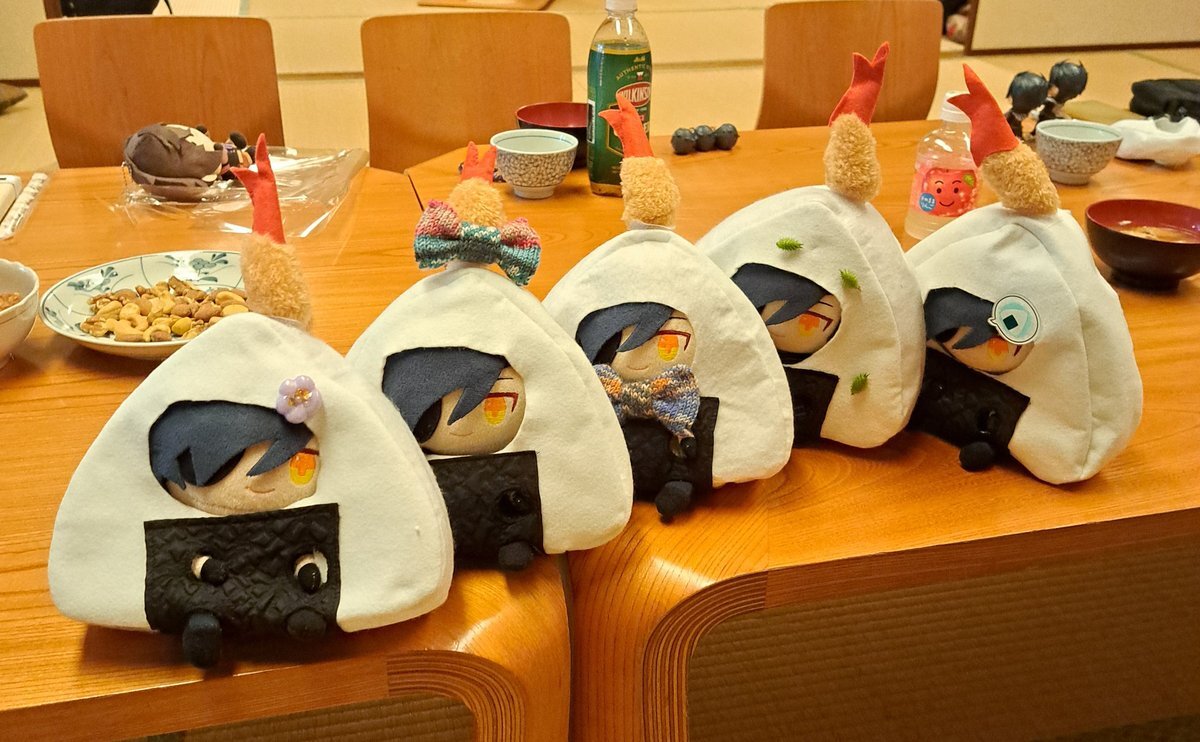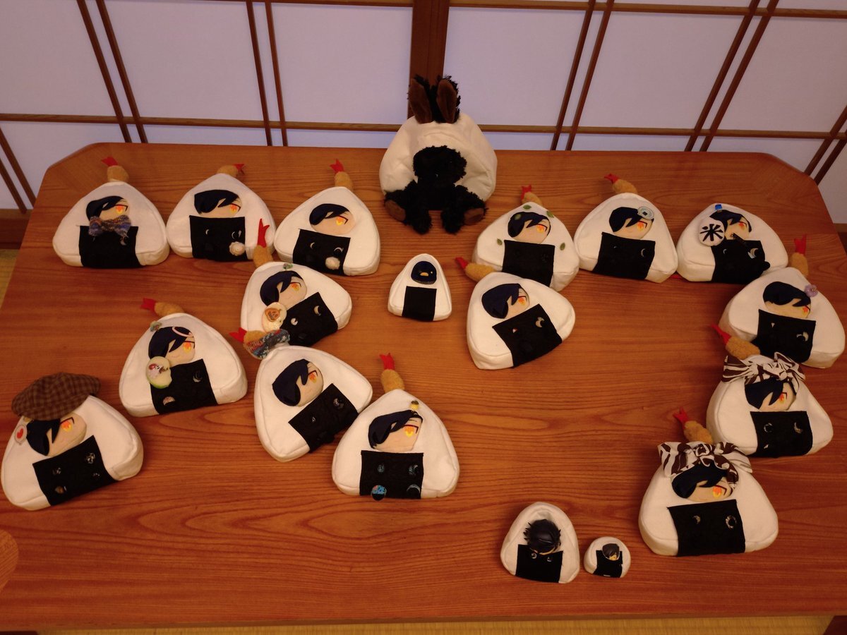 どうしたすわ、そんな顔して✨ みんなでおにぎりになりたいすわ✨ 白米会に、いぬしろさん@hmhmsikが皆のぶんのおにぎりスーツ(仮)作ってきてくださって、とってもおにぎりでした🍙おにぎりのスワ文字、壮観! #立体燭秋の白米会 pic.x.com/BBz5us5kjI