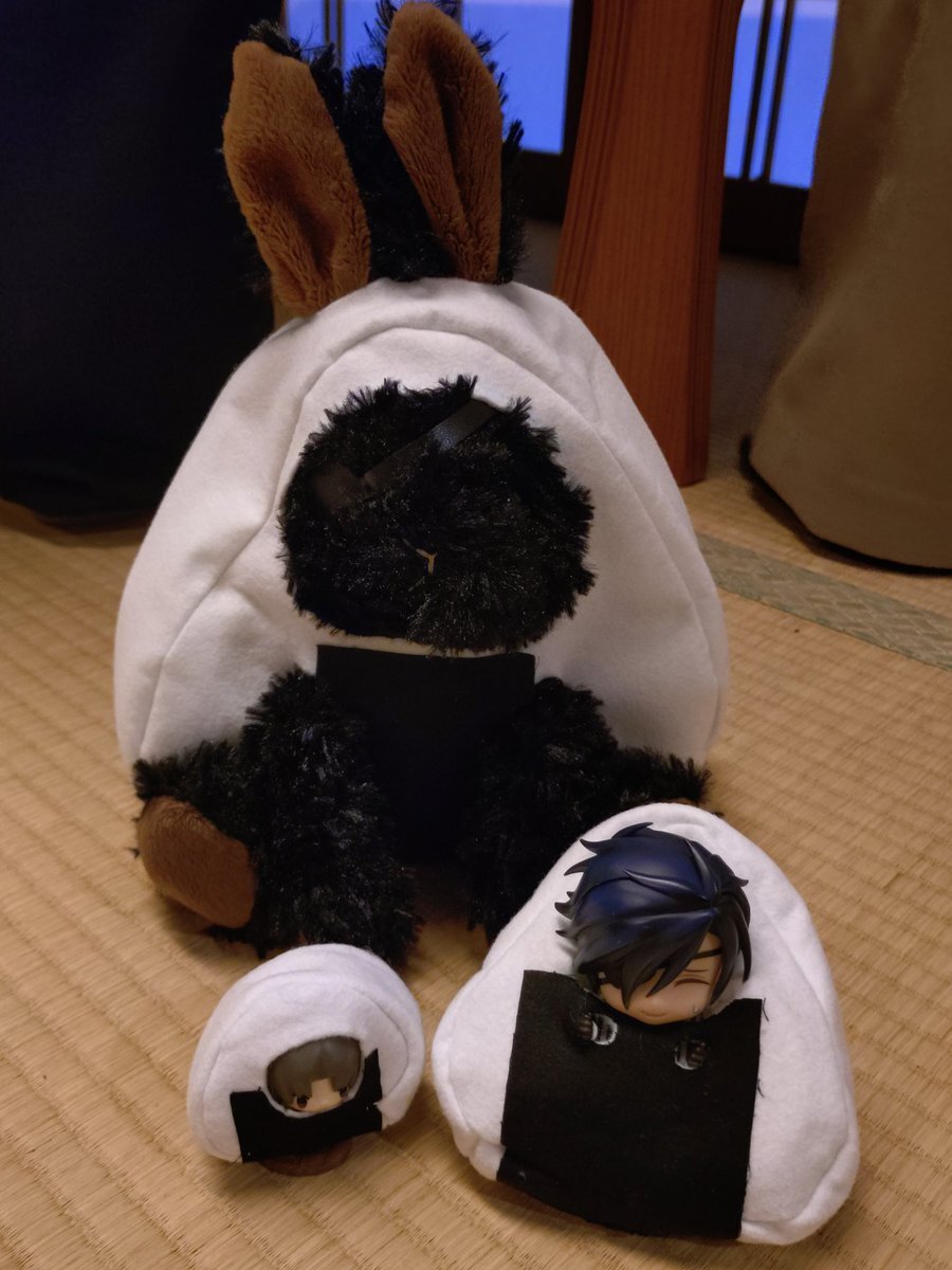 いぬしろさん@hmhmsikにうちのラビにもおにぎりの着ぐるみを頂きました。:゚(;´∩`;)゚:。 お揃い嬉しいです可愛い🍙 #立体燭秋の白米会 pic.x.com/6epAyD7lRx