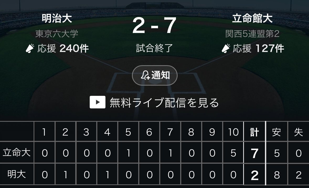 【試合終了】 vs明治大学 7-2で勝利! 皆様、たくさんのご来場とご声援ありがとうございました!! #恩返し #立命館大学 #立命館大学硬式野球部 #第56回明治神宮野球大会 pic.x.com/3FohqU4u8F