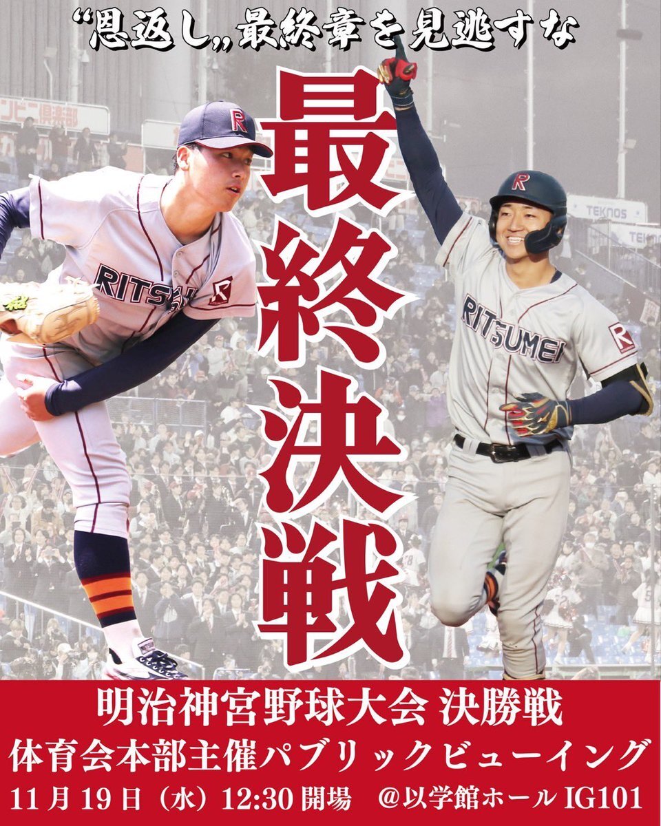 【第56回明治神宮野球大会】 パブリックビューイングを開催します🎦 この度6年半ぶりのリーグ優勝、10年ぶりの神宮大会出場。 そして、史上初の決勝進出を果たしました🎊 明日13時 @以学館ホール ぜひ、お越しください! #恩返し #立命館大学 #立命館大学硬式野球部 #パブリックビューイング pic.x.com/K2TTcJWQU4