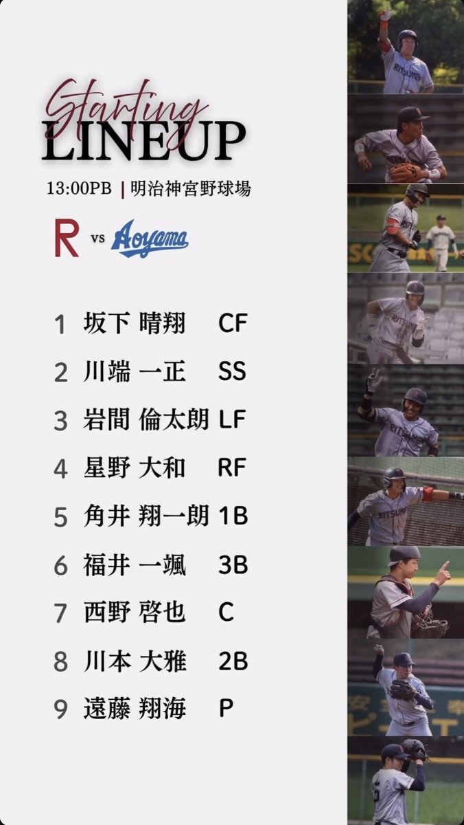 【本日のスタメン】 vs青山学院大学 13:00PB スター軍団を要する青学とついに対戦。 ここまで快進撃を見せてくれた立命も決して負けていません! 結果で #恩返し を🔥 皆様、ご声援よろしくお願いいたします! なお、Sportsナビ/バーチャル高校野球にてライブ配信中です🎥 #立命館大学硬式野球部 pic.x.com/eoLHtIvdzk