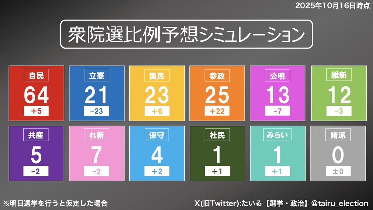 次期衆議院選挙 比例議席票数 シミュレーション(10/16時点) ①自民 1548万票☠️ ②参政 698万票🐦‍🔥 ③国民 679万票 ④立憲 607万票 ⑤公明 415万票 ⑥維新 396万票 ⑦れ新 281万票 ⑧共産 268万票 ⑨日保 200万票 ⑩社民 142万票 ⑪みら 94万票 時事通信の世論調査を反映 #参政党 x.com/kanajomonjin_/…