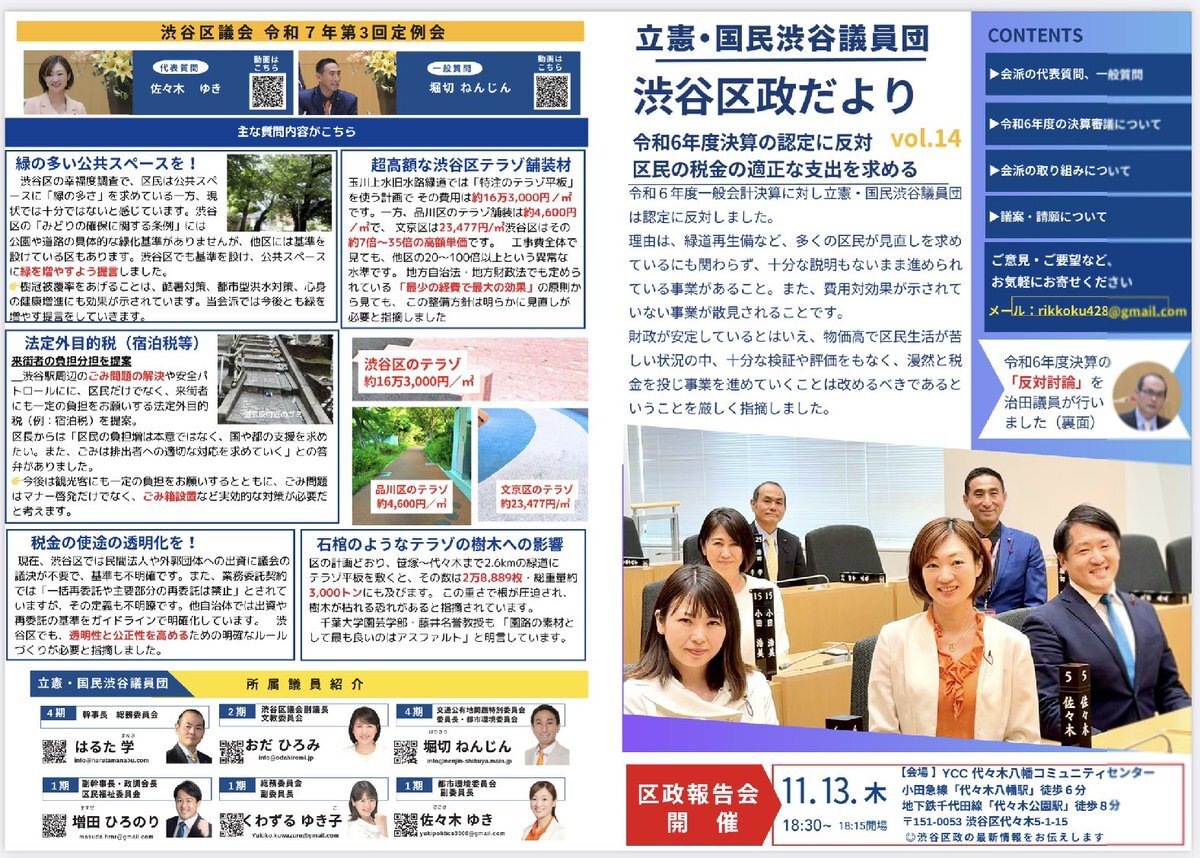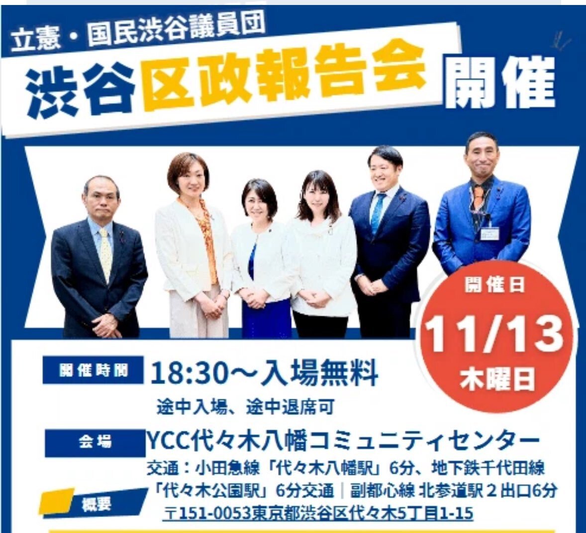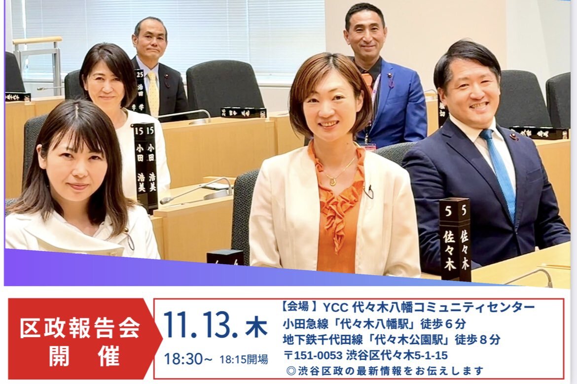 本日です! 立憲・国民渋谷議員団区政報告会 11月13日(木)18:30〜 YCC代々木八幡コミュニティセンター(渋谷区代々木5-1-15) どなたでもご参加頂けます。 お気軽にお越しください! #渋谷区 #渋谷区議会 #立憲・国民渋谷議員団 #はるた学 pic.x.com/FZcXE7g6Kf