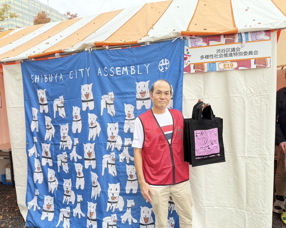 今日は、明日11月2日まで開催される、渋谷くみんの広場ふるさと渋谷フェスティバル2025へ。#渋谷区議会、多様性社会推進特別委員会のブースを見て頂いた方に、障がい者の方が描いたかわいい犬のデザインのエコバックをお配りしました。 #渋谷区 #立憲・国民渋谷議員団 #はるた学 pic.x.com/PHgoOvgM79