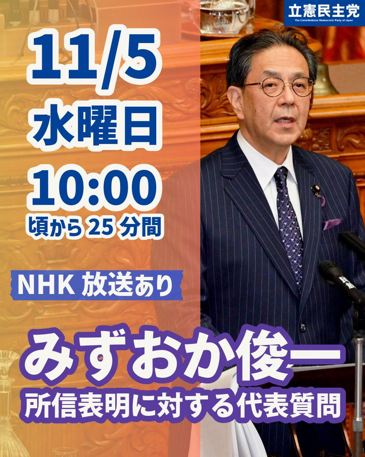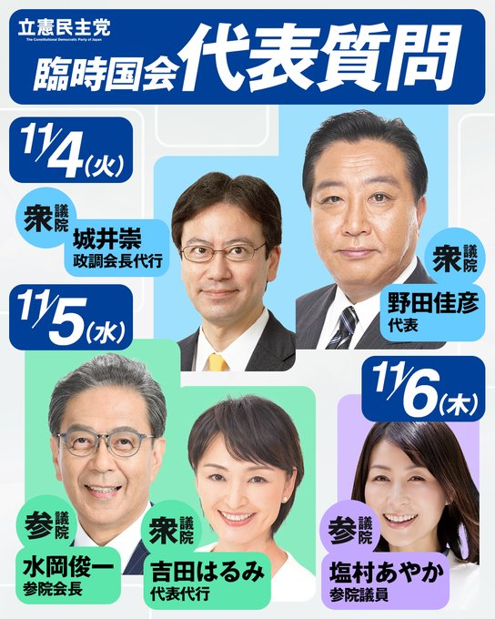 #国会を見よう 立憲民主党 11月5日(水) 参議院【本会議】10時 🔶水岡俊一さん(25分)全国 youtube.com/watch?v=KpHPrk… 衆議院【本会議】13時 🔶吉田はるみさん 東京8区 youtube.com/watch?v=HyJiHF… 【予算委員会】12時 枝野幸男委員長 【懲罰委員会】12時20分 手塚よしお委員長 shugiintv.go.jp/jp/