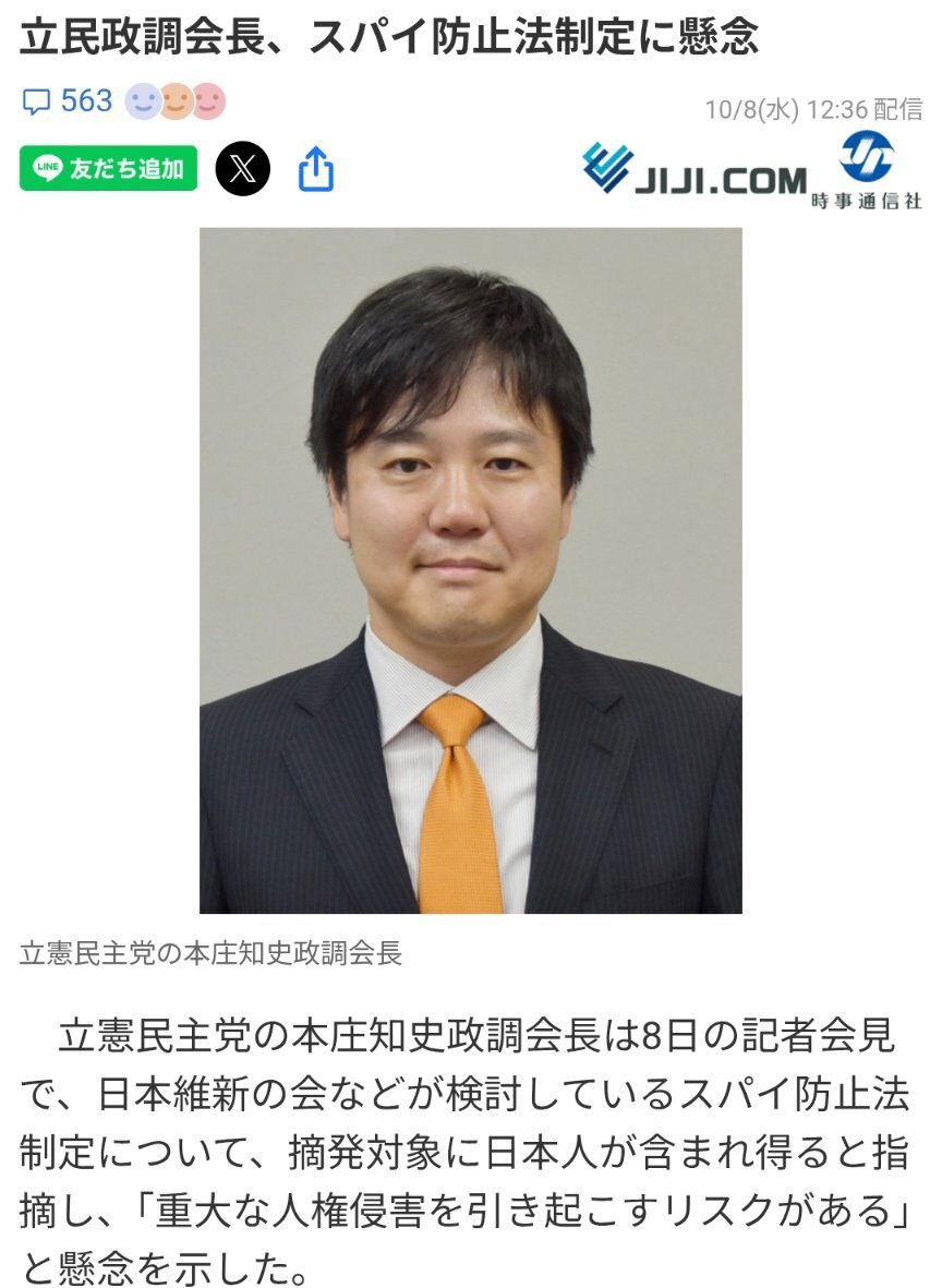立憲民主の本庄知史氏は、 バカなのかもしれないな スパイを取り締まるんだから当たり前でしょ? #立憲民主党は国民の敵 #立憲民主党にうんざり #立憲に騙されるな x.com/hide_q_/status…