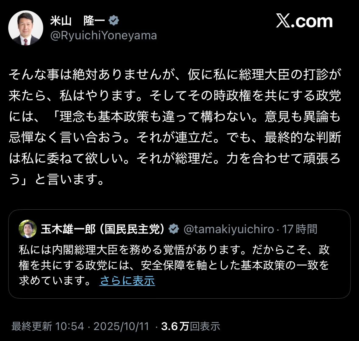 コメント 立憲に誘われて嬉しいんだろ 玉木氏 どんな想いで立憲と分かれたか知ってんのか 選挙のことだけ考えて政策曲げて誤魔化してやるんだったらあのとき立憲に行ってる 政策の一致もないのに立憲と数合わせでやることは絶対にない 政策曲げてまで数合わせするなら国民民主党はいらない