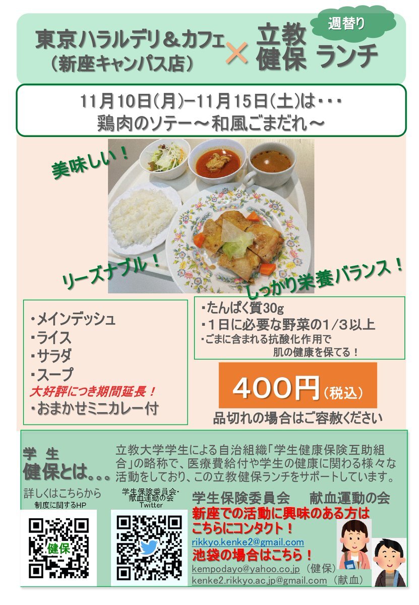 [新座食堂]東京ハラルデリ&カフェ「立教健保ランチ」11/10-のメニューは画像をチェック👇栄養バランスがとれた定食を学生健保のサポートにより400円で提供 ✨#立教大学学生部 #立教食堂 #新座キャンパス #東京ハラルデリカフェ #立教大学学生健康保険互助組合 pic.x.com/lp2pwzFA9c
