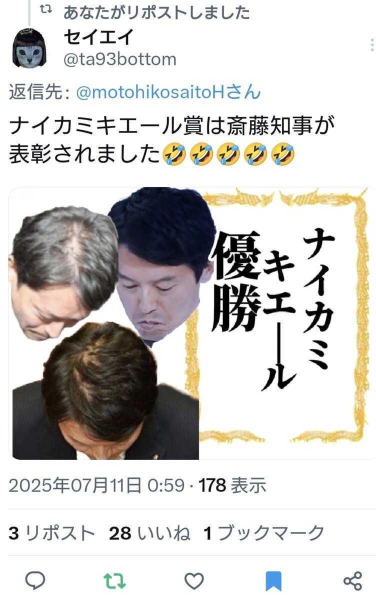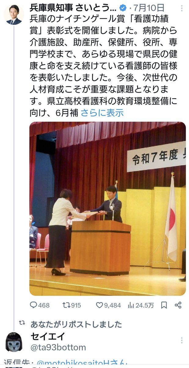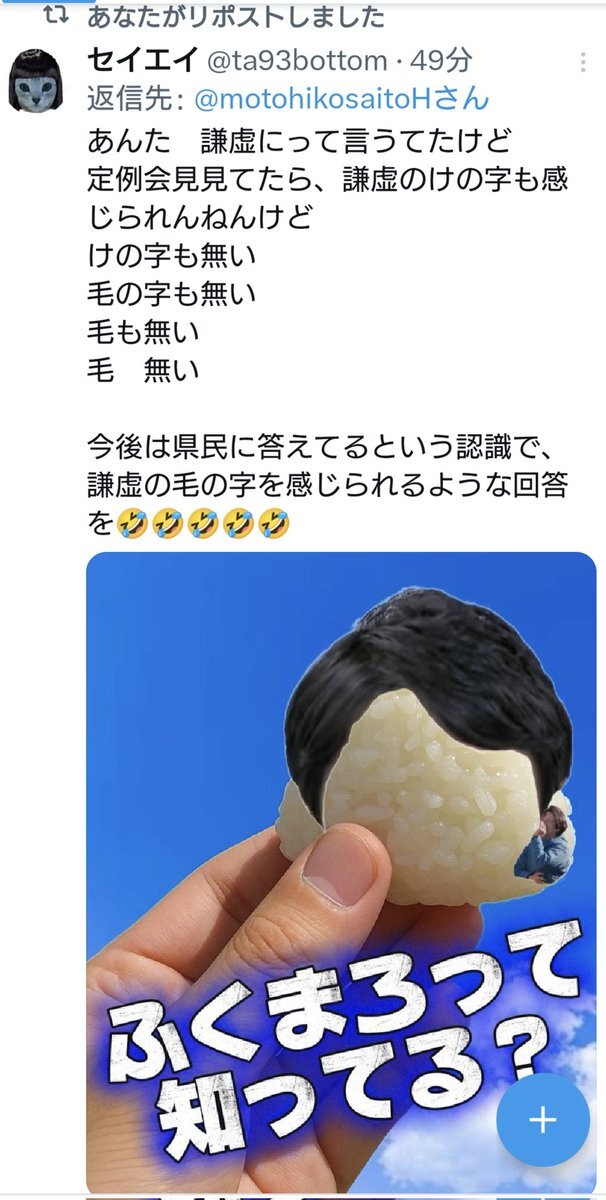返信先:@motohikosaitoH#斎藤元彦は公益通報者保護法違反 #2馬力選挙 #立花逮捕 #斎藤元彦は社会人失格 なにが「参加いただきました」だよ🖕 立花なんかと二馬力したインチキ知事のくせに上から目線で偉そうに🖕 pic.x.com/kOhIFL0MLo
