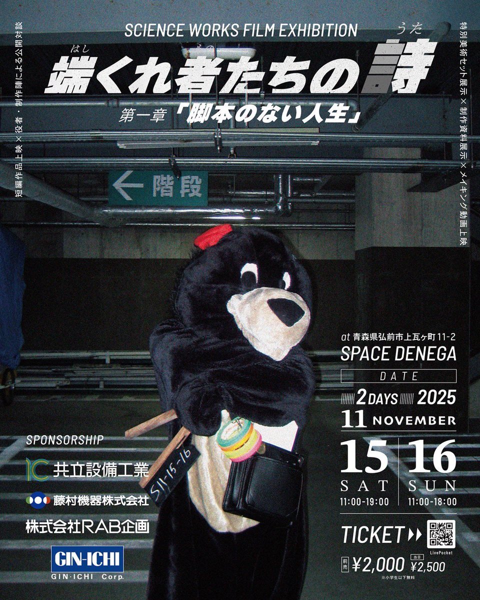 #SCIENCEWORKS さんの映像展 『 #端くれ者たちの詩 』 ご来場くださった皆様、ありがとうございました! 想像力で舞台の上に弘前を創る演劇とは違い、本当の弘前の街を背景にもうひとつの街と人生を創る映像作品たち。良い現場を頂きました。 SCIENCEWORKSの皆様、本当にありがとうございました! pic.x.com/YtUhBS3eYQ