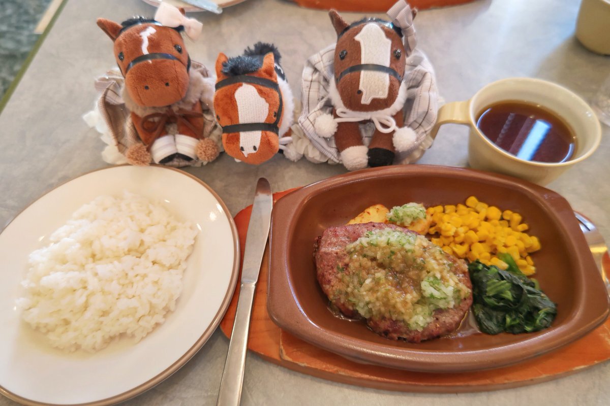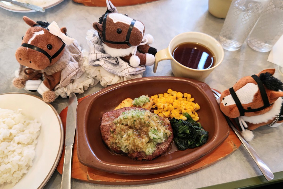 #競馬ぬい撮り #ぬい撮り お昼ご飯✨ サイゼリアのハンバーグと メロちゃん&サラメロちゃんと エールちゃん🐴🐴🐴✨✨✨ pic.x.com/vw4ITPTRr5