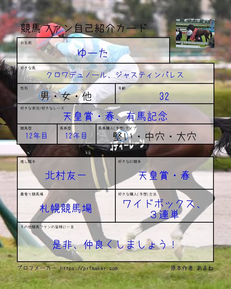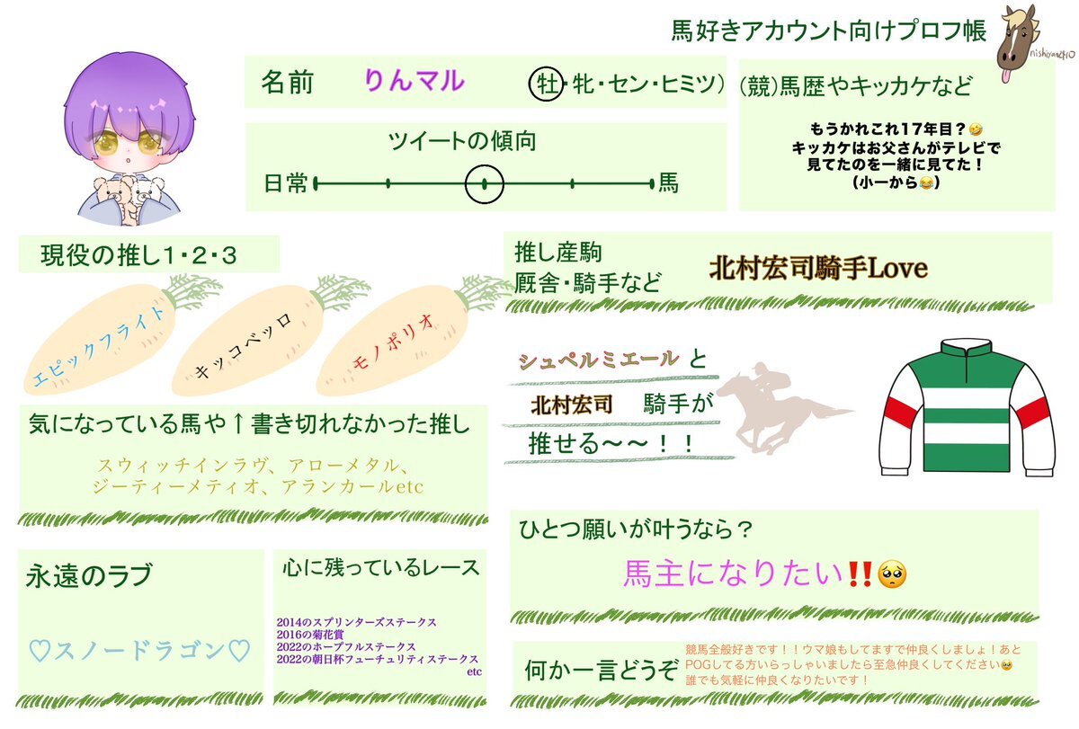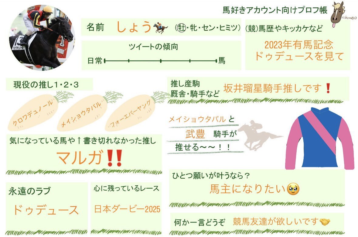 これ流れてきて羨ましくなって俺も作っちゃった🏇 全然競馬友少ないのでこれを機に絡み増やしたい!ウマ娘もPOGもしてるよ! ♡orRPで迎えに行きます! ぜひ誰でも気軽に‼️ #競馬好きと繋がりたい #競馬好きな人と繋がりたい #競馬男子 #競馬ファンと繋がりたい #馬好きアカウント向けプロフ帳 pic.x.com/xIurd9Oadg