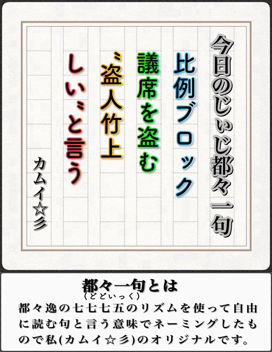 『今日のじぃじ都々一句』 政治系の今話題になっている事を都々逸のリズムで読んでいます。 『比例ブロック 議席を盗む “盗人竹上しい”と言う』 ※党名で得た議席のまま離党する盗人猛々しい人物をこれからは『盗人竹上しい』と言われそうですね。 #竹上ゆうこの辞職を求めます #盗人竹上しい pic.x.com/9DHayi3Ipo