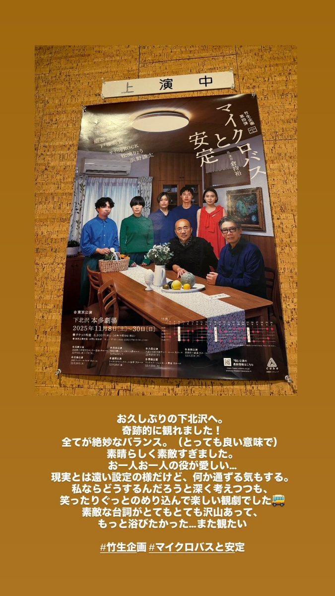 #竹生企画 「#マイクロバスと安定」を観劇。3年後にやって来る世界の終わりがチラホラしながらも、リアルなやり取りがめちゃ面白い! サリngさんはとっても素敵✨だったよー😆 クールな俳優役でカッコいいけど、叫ぶとこと黙々とある作業をやってるとこも好き😆 #サリngROCK pic.x.com/F61I3rvcpd