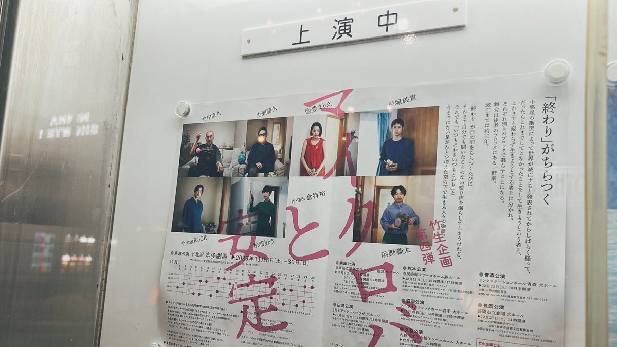 #竹生企画 当日券チャレンジ成功。 終わりが決まった世界で皆どんな風に生きるか。自分ならどうするだろうか。観終わってからも、胸に残って考えさせられる作品でした。観れて良かった。 pic.x.com/fcjN7IhaN3